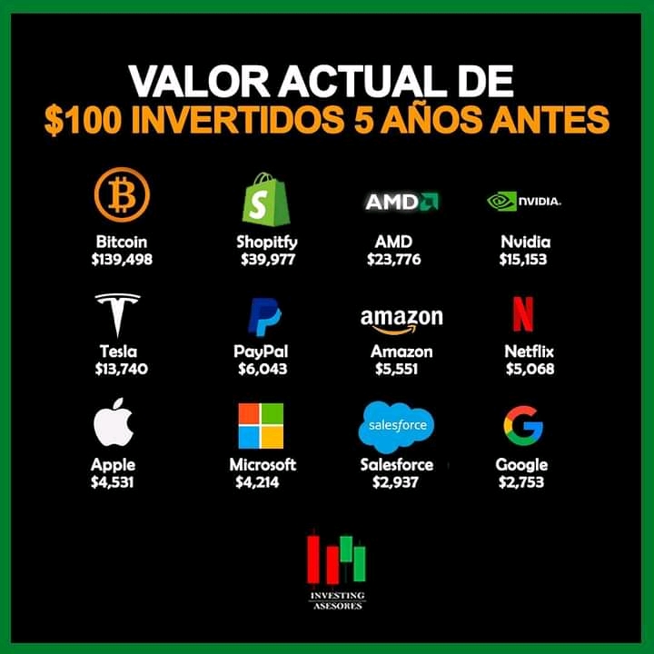 En esta imagen muestro las ganancias que hubieras obtenido al invertir solamente 100 dólares 5 años atrás, al momento de leer este artículo puede ser incluso mucho más