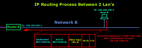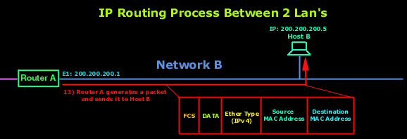 13)The frame generated from the router's E1 interface has the source hardware address of E1 interface and the hardware destination address of Host B's network interface card. However, the most important thing here is that even though the frame's source and destination hardware address changed at every interface of the router it was sent to and from, the IP source and destination addresses never changed. The packet was never modified at all, only the frame changed.