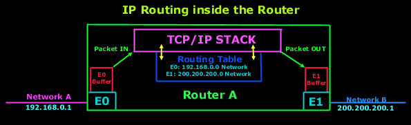 In our example, we have 2 networks, Network A and Network B. Both networks are connected via a router (Router A) which has 2 interfaces: E0 and E1. These interfaces are just like the interface on your network card (RJ-45), but built into the router.