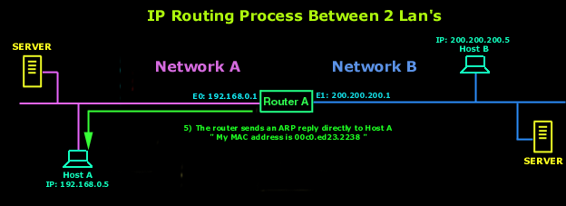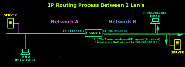 If it doesn't find it in there it means that either a long time has passed since it last contacted the router or it simply hasn't resolved the IP address of the router (192.168.0.1) to a hardware address (MAC). So it then sends an ARP broadcast. This broadcast contains the following "What is the hardware (MAC) address for IP 192.168.0.1 ? ". The router identifies that IP address as its own and must answer, so it sends back to Host A a reply, giving it the MAC address of its E0 interface. This is also one of the reasons why sometimes the first "ping" will timeout. Because it takes some time for an ARP to be sent and the requested machine to respond with its MAC address, by the time all that happens, the TTL (Time To Live) of the first ping packet has expired, so it times out!