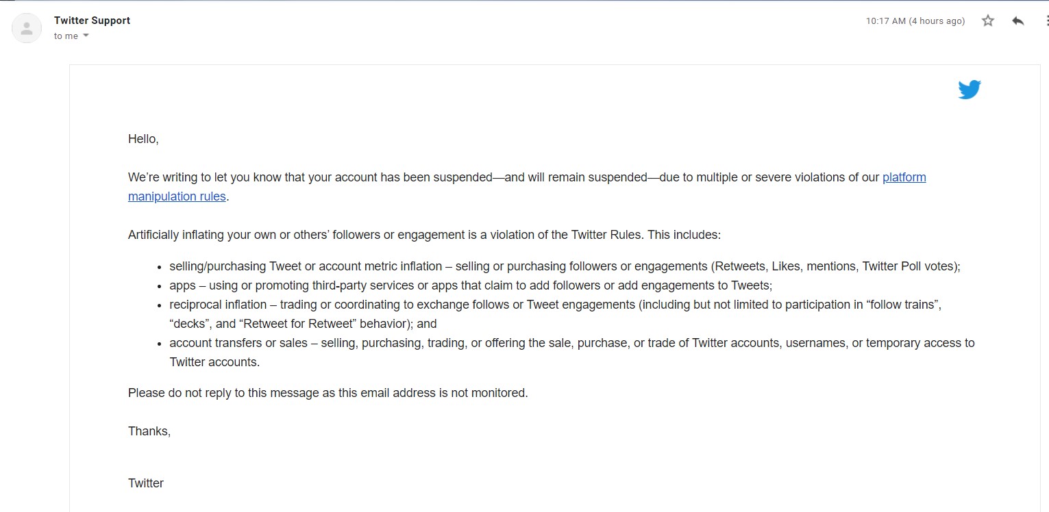 All I did was give away my crypto to help others get involved. I gave away EVERYTHING I earned and won in my 5 year crypto journey. I was 100% legit and others started asking me to host giveaways. Whatever I earned went to my Pickaw Random draw fee, sending fee and to cover crypto price drops. Anything that was left I used to make my own giveaway to help others. I was just happy to have something to give that was not mine. I helped people all over the World and Twitter bans me for LIFE! They IP banned and all my devices so now my kids wont even be allowed to make a Twitter now because of this. I have spent so much time helping Twitter. I even won $1000 from Jack and gave away all of it on twitter to help people when covid started. Yet I have to check my email 20 times a day for appeal reply and 4 months later I get told this