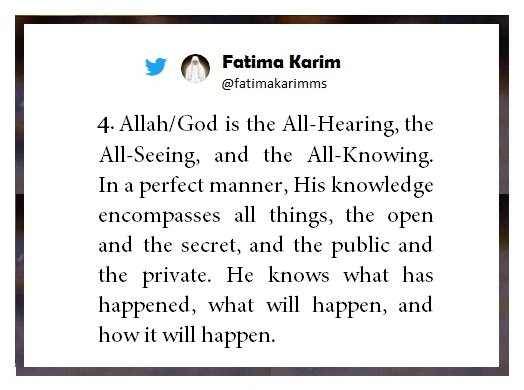 Allah/God is the All-Hearing, the All-Seeing, and the All-Knowing. In a perfect manner, His knowledge encompasses all things, the open and the secret, and the public and the private. He knows what has happened, what will happen, and how it will happen.