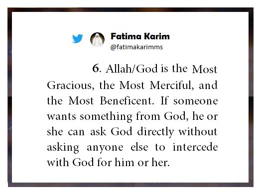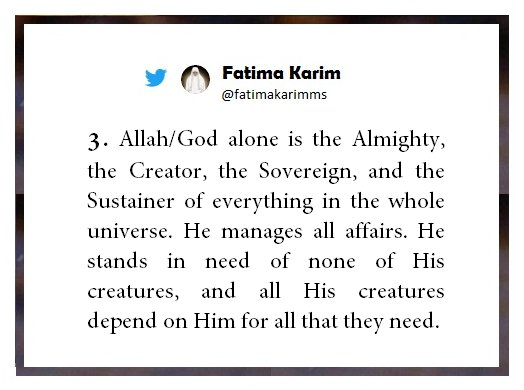 No one has the right to be invoked, supplicated, prayed to, or shown any act of worship, but God alone. God alone is the Almighty, the Creator, the Sovereign, and the Sustainer of everything in the whole universe. He manages all affairs. He stands in need of none of His creatures, and all His creatures depend on Him for all that they need. He is the All-Hearing, the All-Seeing, and the All-Knowing. In a perfect manner, His knowledge encompasses all things, the open and the secret, and the public and the private. He knows what has happened, what will happen, and how it will happen. No affair occurs in the whole world except by His will. Whatever He wills is, and whatever He does not will is not and will never be. His will is above the will of all the creatures. He has power over all things, and He is able to do everything. He is the Most Gracious, the Most Merciful, and the Most Beneficent. In one of the sayings of the Prophet Muhammad , we are told that God is more merciful to His creatures than a mother to her child. God is far removed from injustice and tyranny. He is All-Wise in all of His actions and decrees. If someone wants something from God, he or she can ask God directly without asking anyone else to intercede with God for him or her.