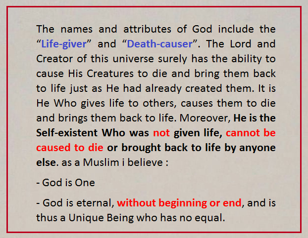 The names and attributes of God include the “Life-giver” and “Death-causer”. The Lord and Creator of this universe surely has the ability to cause His Creatures to die and bring them back to life just as He had already created them. It is He Who gives life to others, causes them to die and brings them back to life. Moreover, He is the Self-existent Who was not given life, cannot be caused to die or brought back to life by anyone else. as a Muslim i believe :