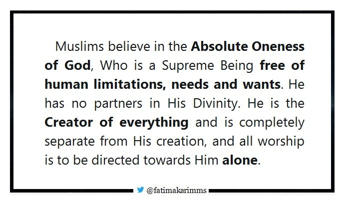Muslims believe in the Absolute Oneness of God, Who is a Supreme Being free of human limitations, needs and wants. He has no partners in His Divinity. He is the Creator of everything and is completely separate from His creation, and all worship is to be directed towards Him alone.