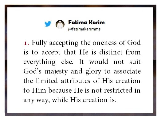 Fully accepting the oneness of God is to accept that He is distinct from everything else. It would not suit God’s majesty and glory to associate the limited attributes of His creation to Him because He is not restricted in any way, while His creation is. He is the First with no beginning and the Last with no end. Everything in the universe was created by His will. He is not confined by space or time and He is the only One who is in control and provides for His creation.