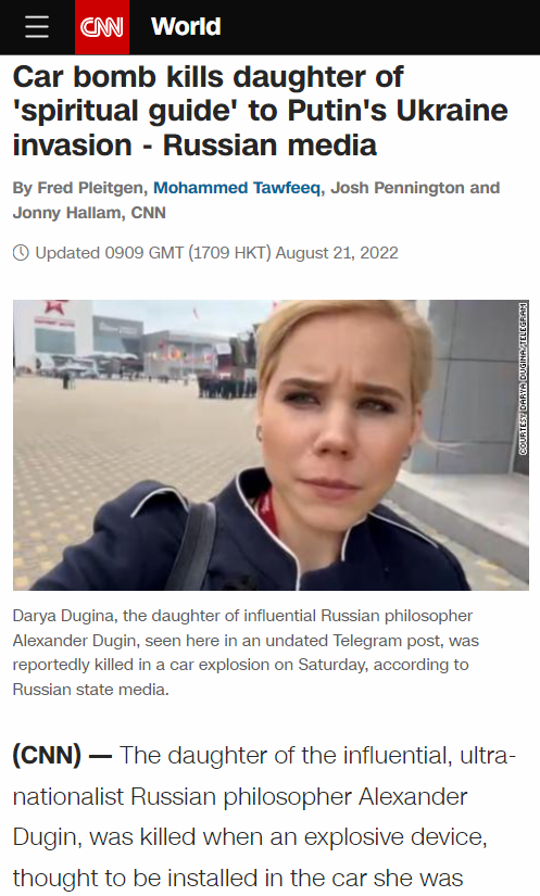 모스크바 폭탄테러로 알렉산드르 두긴 딸 사망