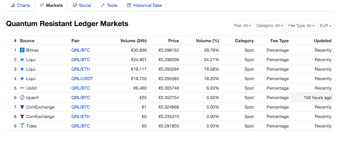 Poi mi sono informato per capire dove andare a scambiare la moneta prodotta, e https://coinmarketcap.com/currencies/quantum-resistant-ledger/#markets mi ha indicato questi exchange