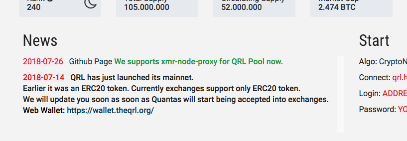 Come vedete tra le monete presenti risulta la migliore da minare, così mi sono attrezzato, ho creato un wallet online su https://wallet.theqrl.org e ho iniziato a minare con i miei rig questa moneta.