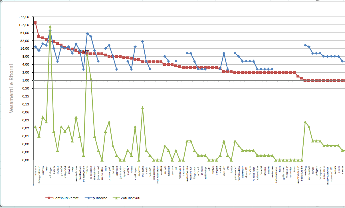 La linea rossa marca i versamenti effettuati dagli utenti, se la linea blu sta sopra allora vi è un guadagno in termini di voti ricevuti considerando che il valore di un voto da Spinbot vale ad oggi circa 2,7$.
