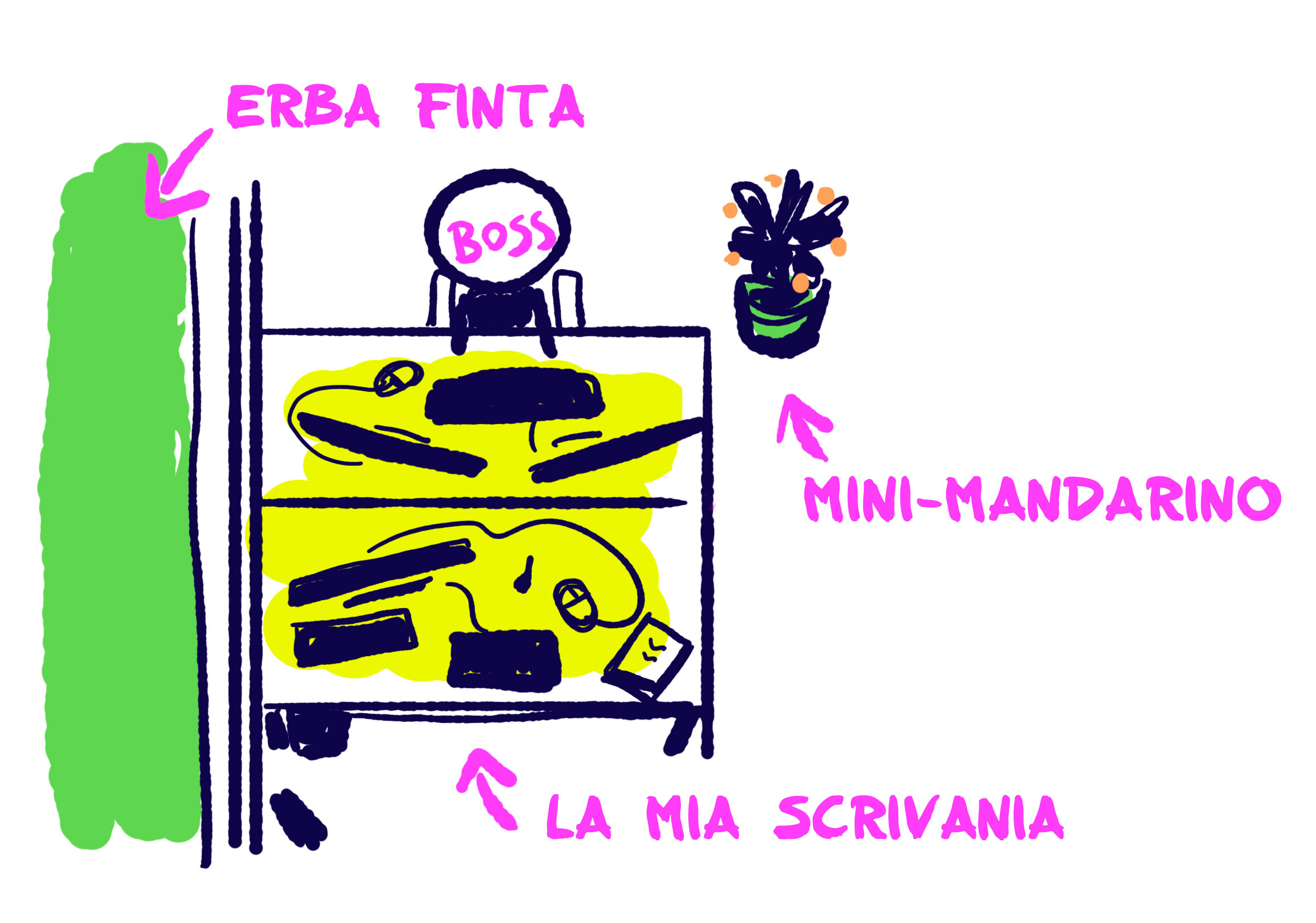 Tra le cose che adoro di più è la mia scrivania in ufficio. La luce naturale entra dalla parete a vetro sulla mia sinistra, dove ogni tanto soffermo lo sguardo ad osservare il piccolo patio affianco. Davanti, coperta da due schermi, c'è la mia boss. È una donna piena di energie, professionale e alla mano quando deve esserlo. Un buon esempio di Business Woman.