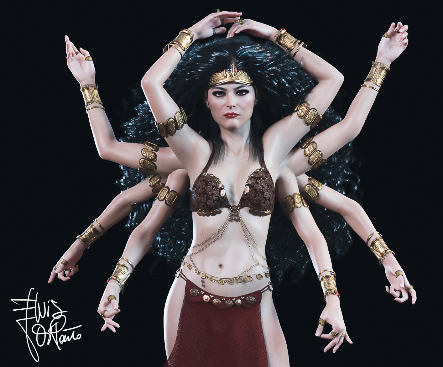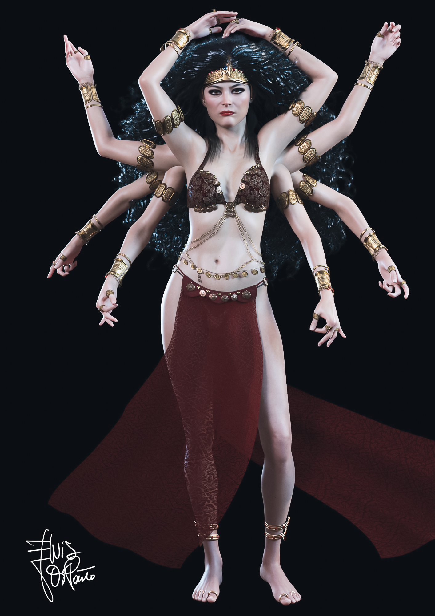 To make this drawing I made the basic figure and duplicated it 3 times so that I had 4 perfectly aligned figures. I modified the position of the arms of each figure so that I had one body and 8 arms. Let's say I humanized the goddess Kali by giving her the appearance of a beautiful woman with long, thick black hair. I adorned her arms with golden bracelets. Her gaze is steady and penetrating.