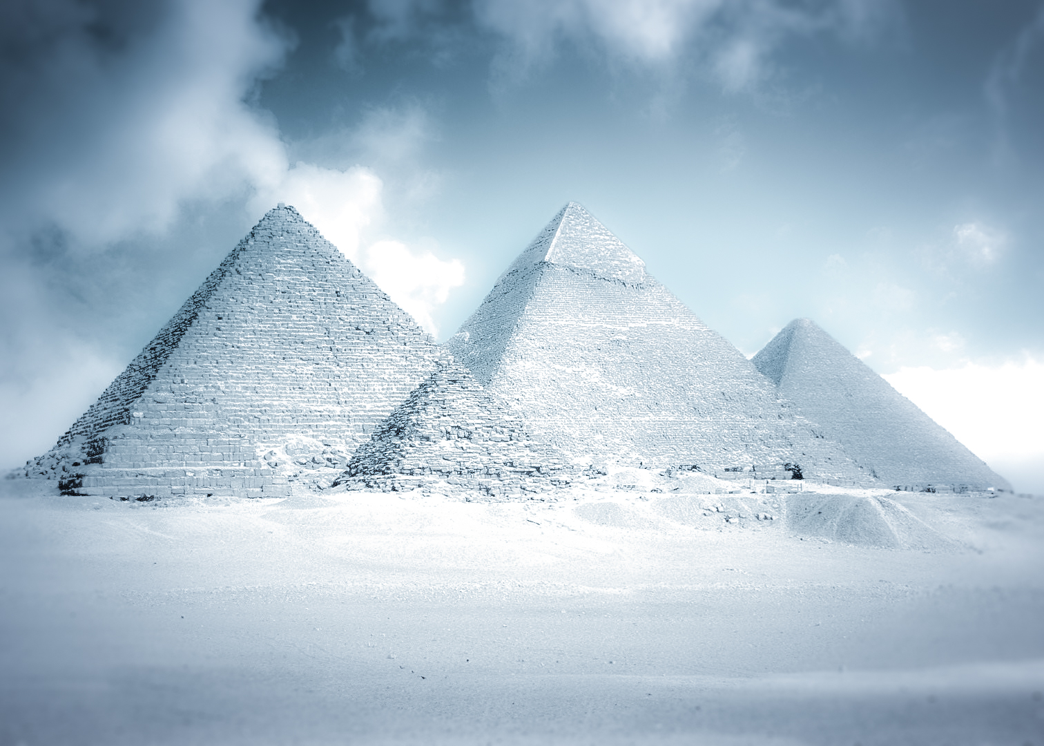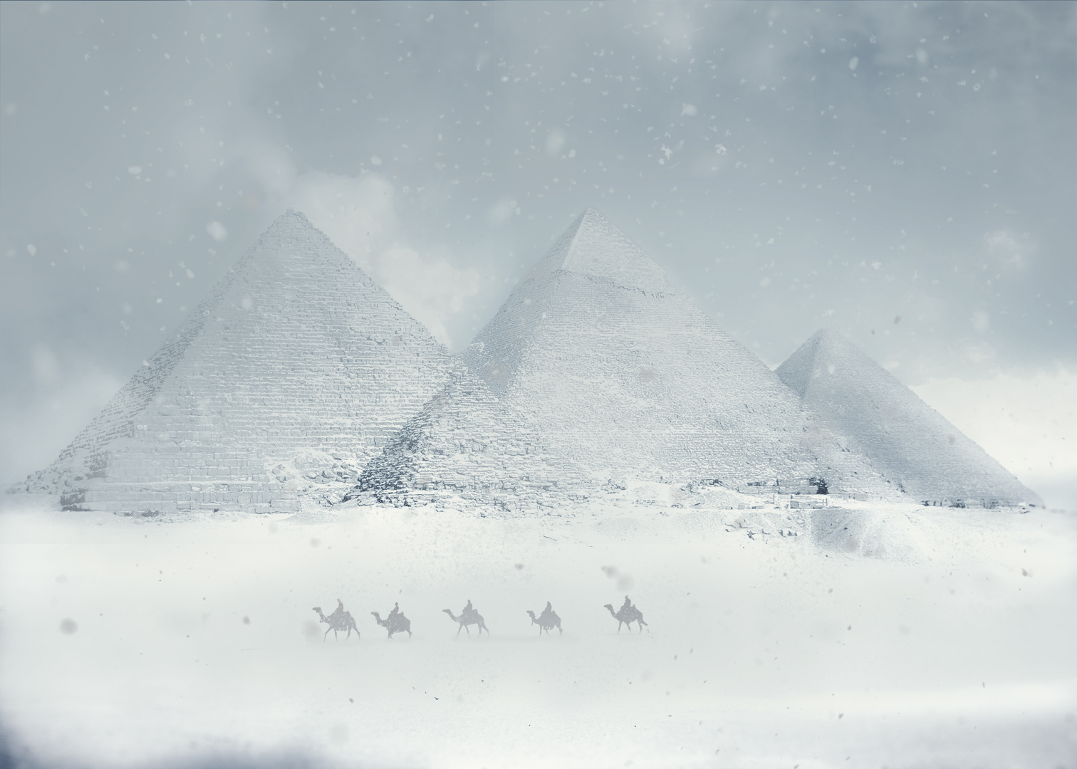 A questo punto ho dipinto con la tavoletta grafica la neve sulla sabbia, ho sbiancato il cielo e aggiunto la foschia sulle cime delle piramidi.