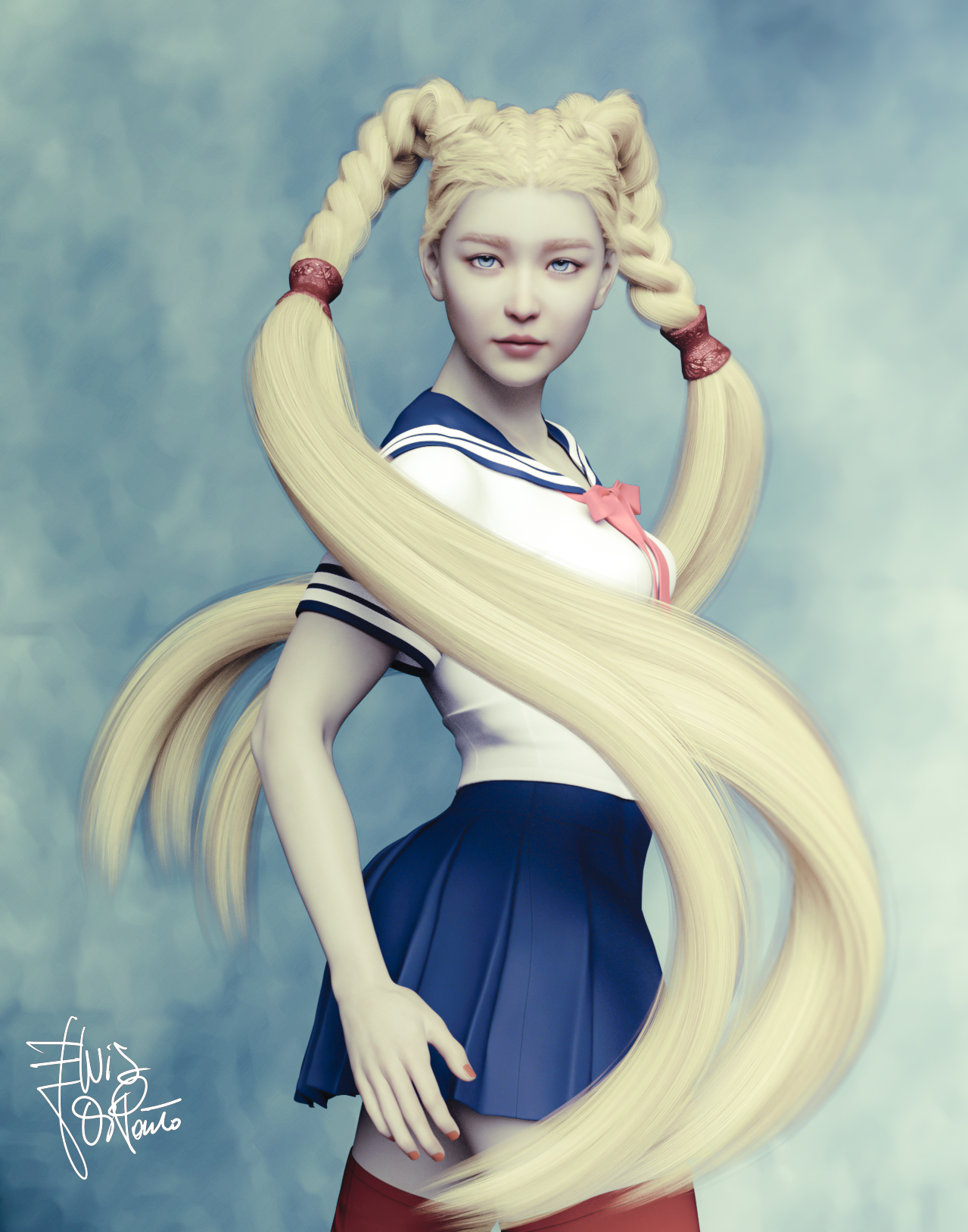 I drew the character with long blonde hair in 3d, I imagined her with a sweet face and two beautiful blue eyes, long blonde tails and the typical Japanese student uniform.