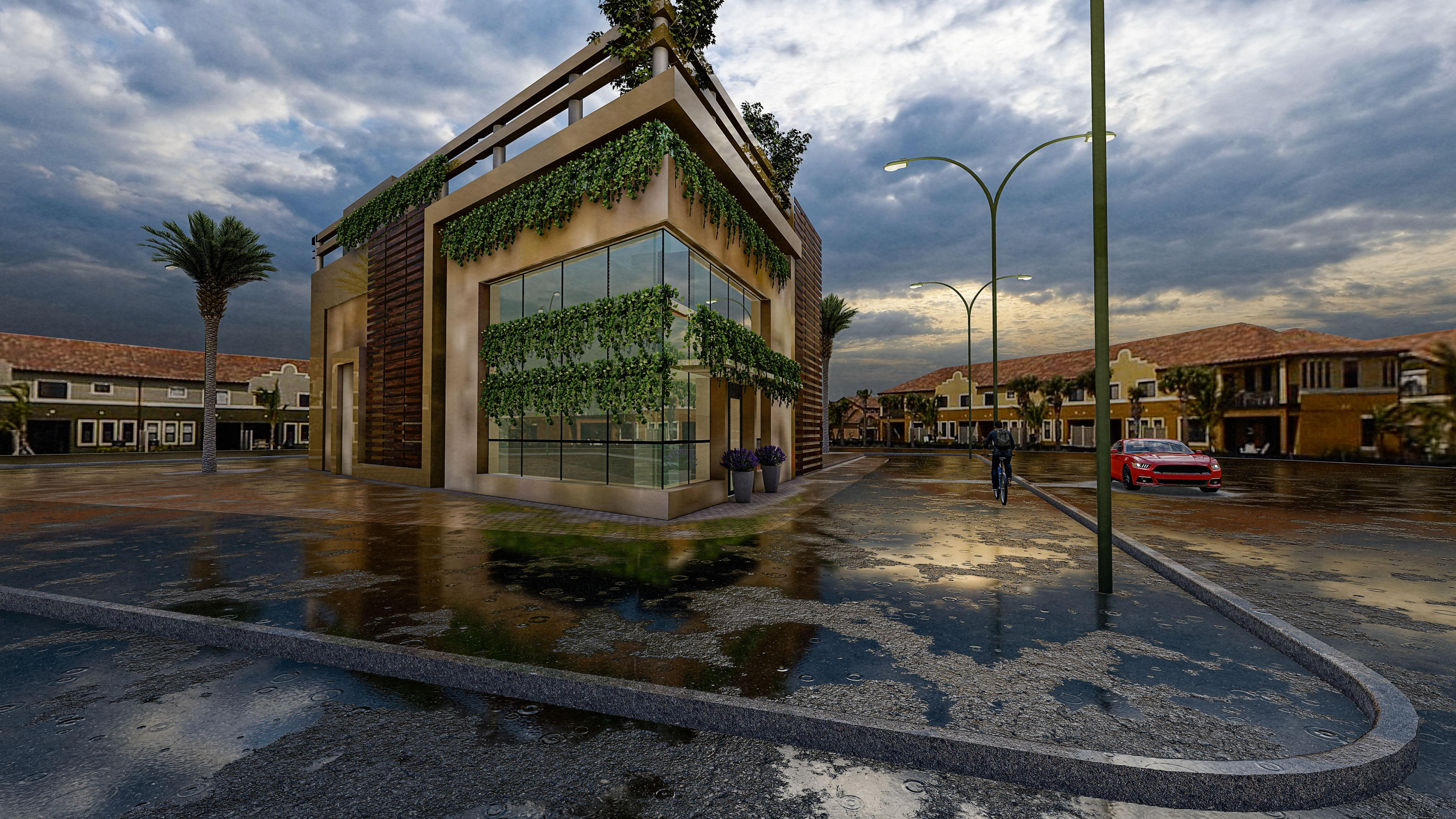 The rendering work was done with Lumion 3d real-time rendering software. The rendering that I place today is the outside of the supermarket. I imagined the scene during a rainy day (even if I imagine that in Iraq they are not very frequent) because it gave some drama to the context. The clients liked the result.