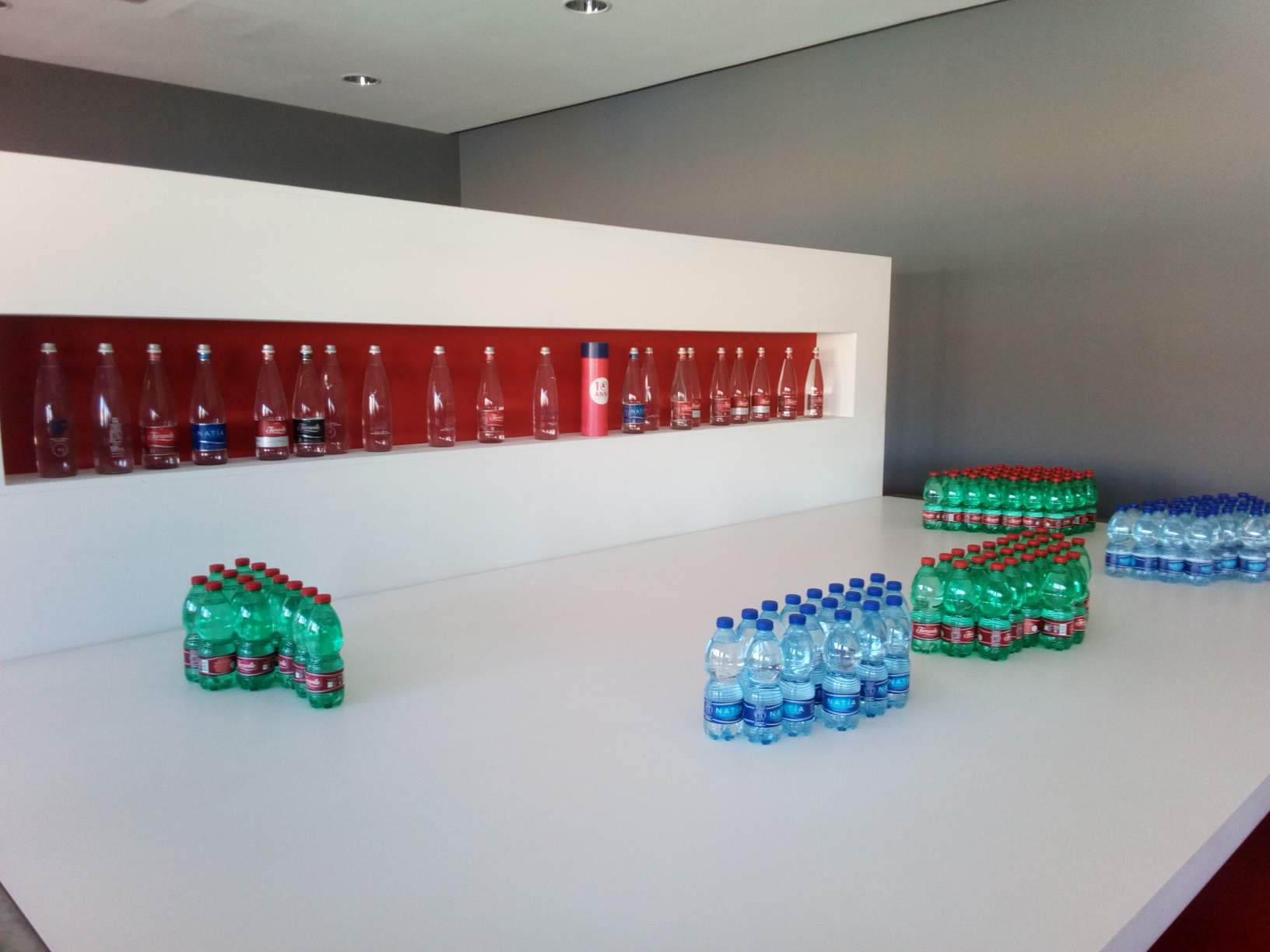 Questo è una parte del grande stabilimento, forse la piú importante, dove avviene, il tutto sotto un rigoroso controllo igienico-sanitario, la trasformazione della plastica, il recupero e lavaggio del vetro, l'imbottigliamento dell'acqua, l'etichettatura e il confezionamento.