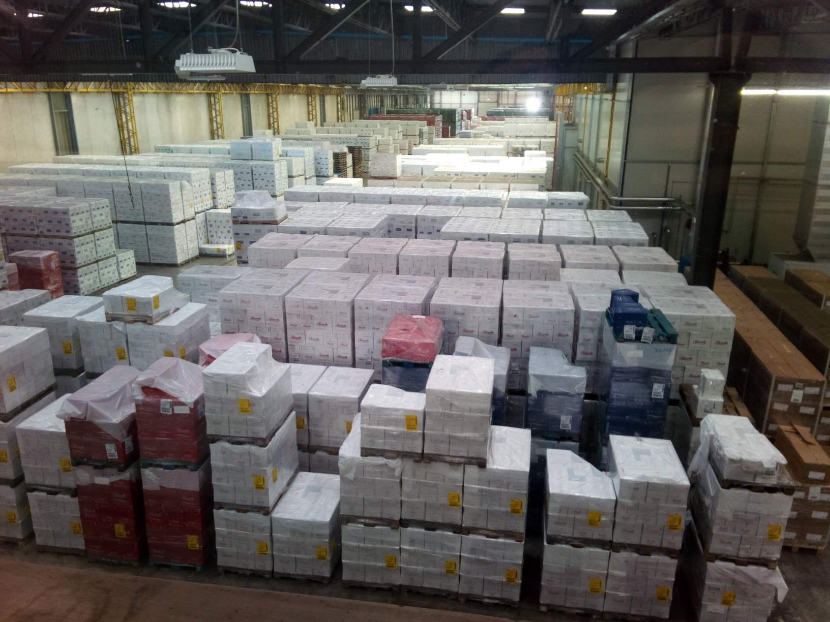 Questa è solamente una piccola parte del magazzino, che si trova invece principalmente sottoterra. La produzione ammonta a 500.000 bottiglie a turno di 8 ore, con 1 milione e mezzo di bottiglie prodotte e confezionate in 24 ore.