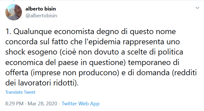 Eccola qui la locuzione magica con la quale i nostri "economisti competenti" sgravano le Scienze Economiche (o ciò che sono diventate) dalle immense responsabilità nella crisi economica appena iniziata e anche sulla gestione della crisi epidemica in corso: "Shock Esogeno" ovvero evento imprevedibile che non è legato a scelte (e dunque a dottrine che le influenzano) di politica economica.
