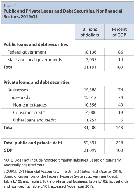 Davvero interessantissima la tabellina pubblicata dalla Federal Reserve e relativa al debito totale (Debito Pubblico + Debito Privato) degli USA al 1° Quadrimestre del 2019. In un anno ovviamente non può essere cambiata di tanto la situazione.