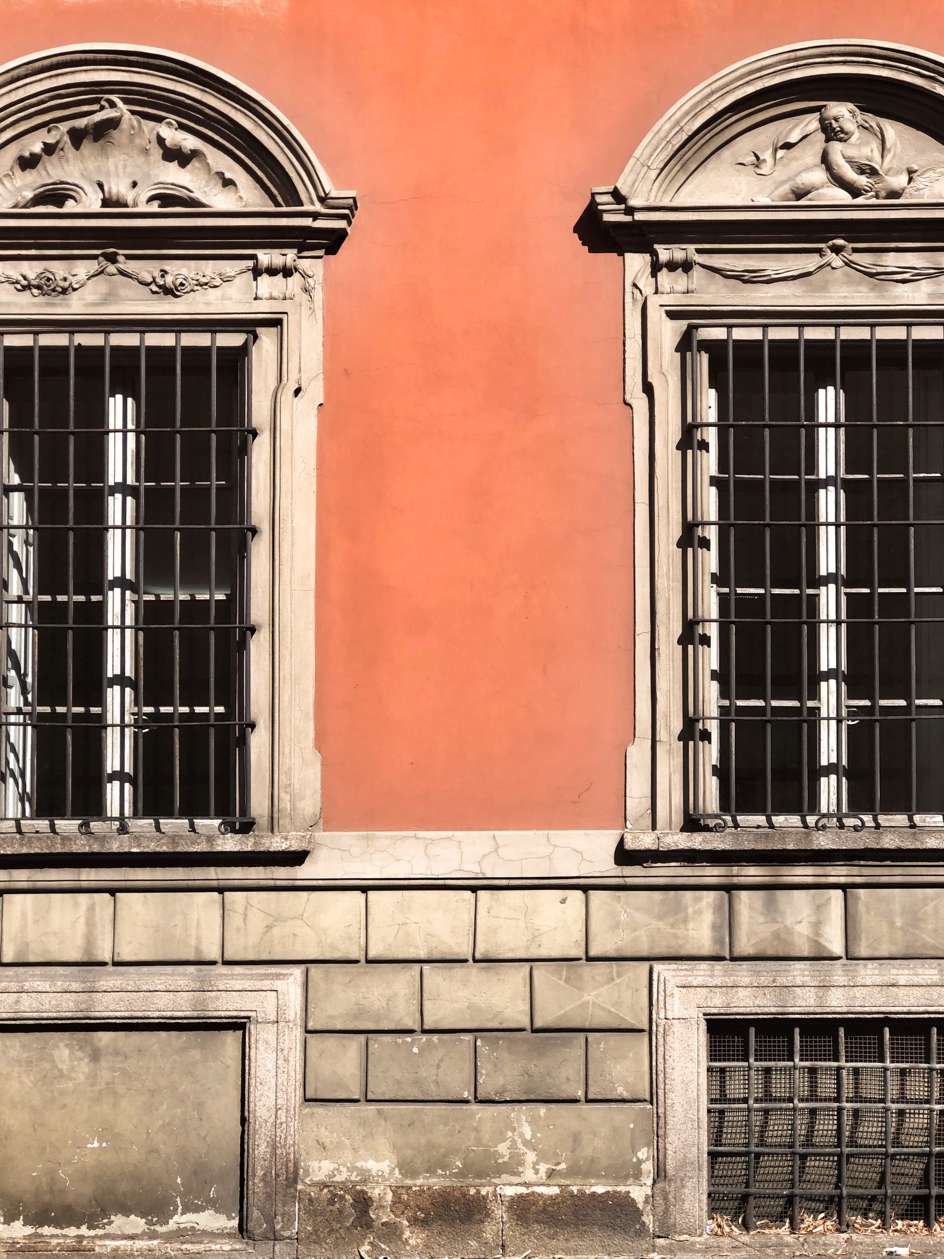Un altro particolare di un palazzo in piena luce, carico di contrasti dati dalle ombre. Mi ha affascinato la geometria regolare, ricercata al punto di creare false bocche di lupo (le finestre delle cantine, quella vera, da cui passeggiando si sente arrivare il fresco) e quella finta, creata solo per amore di simmetria.