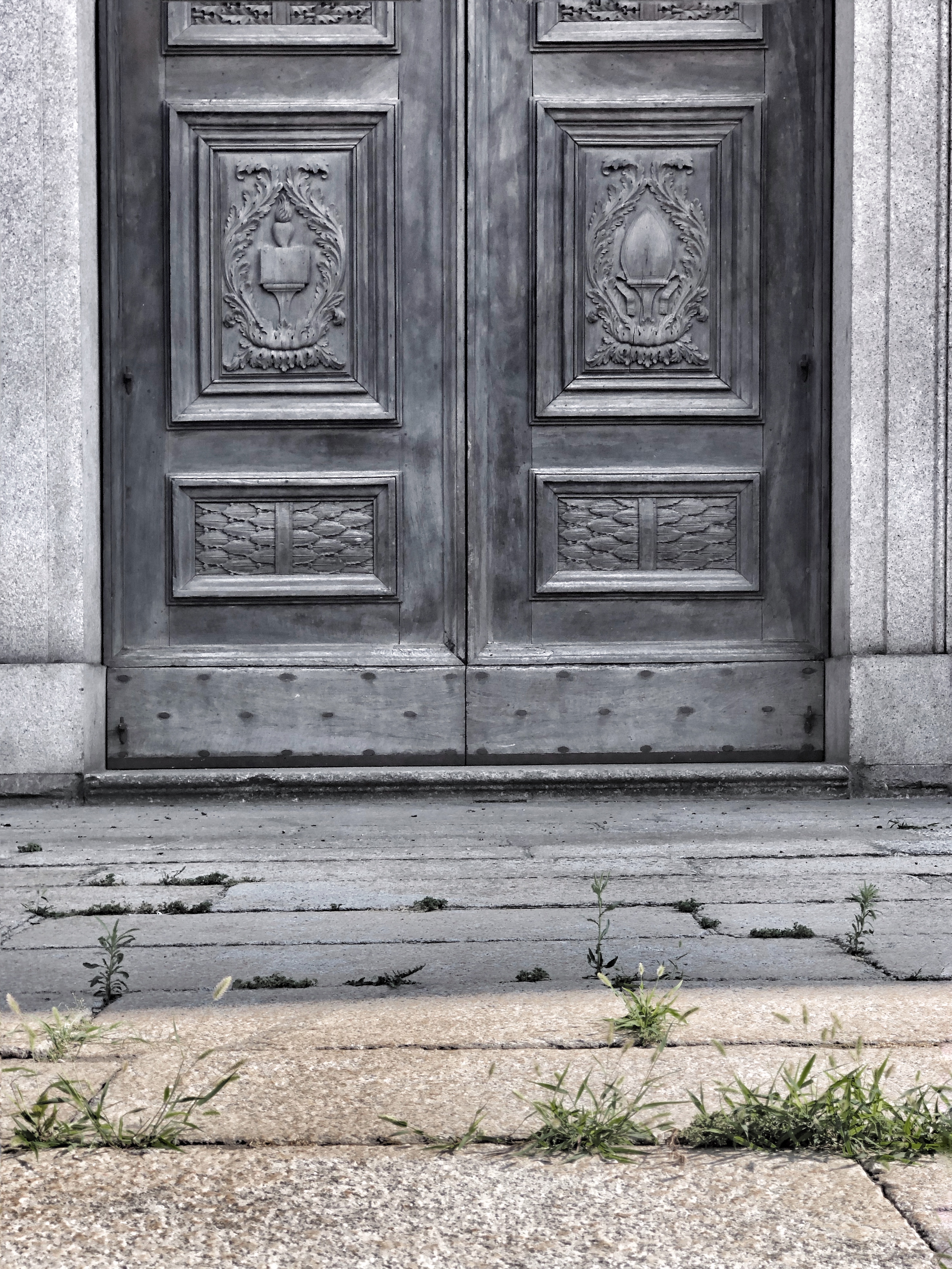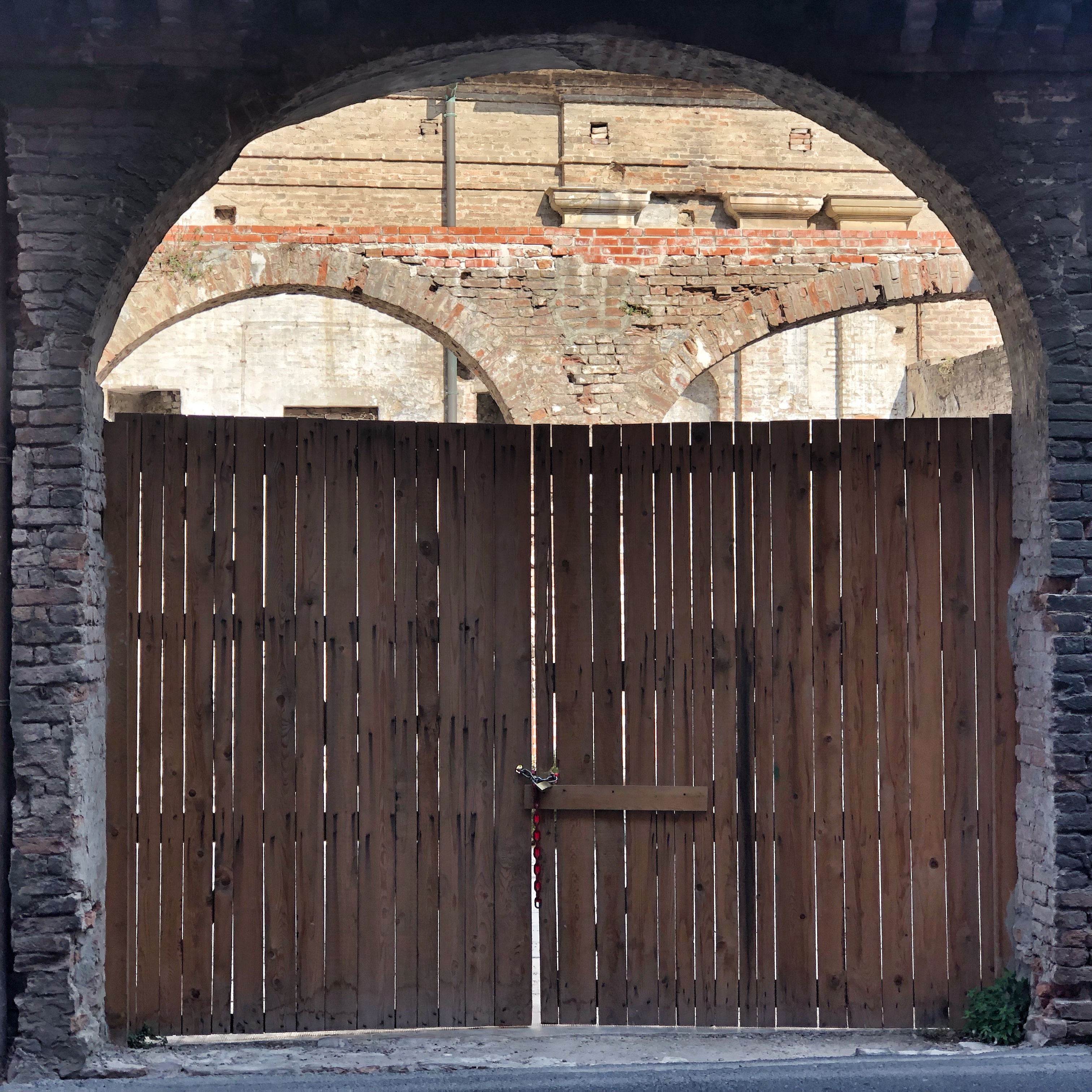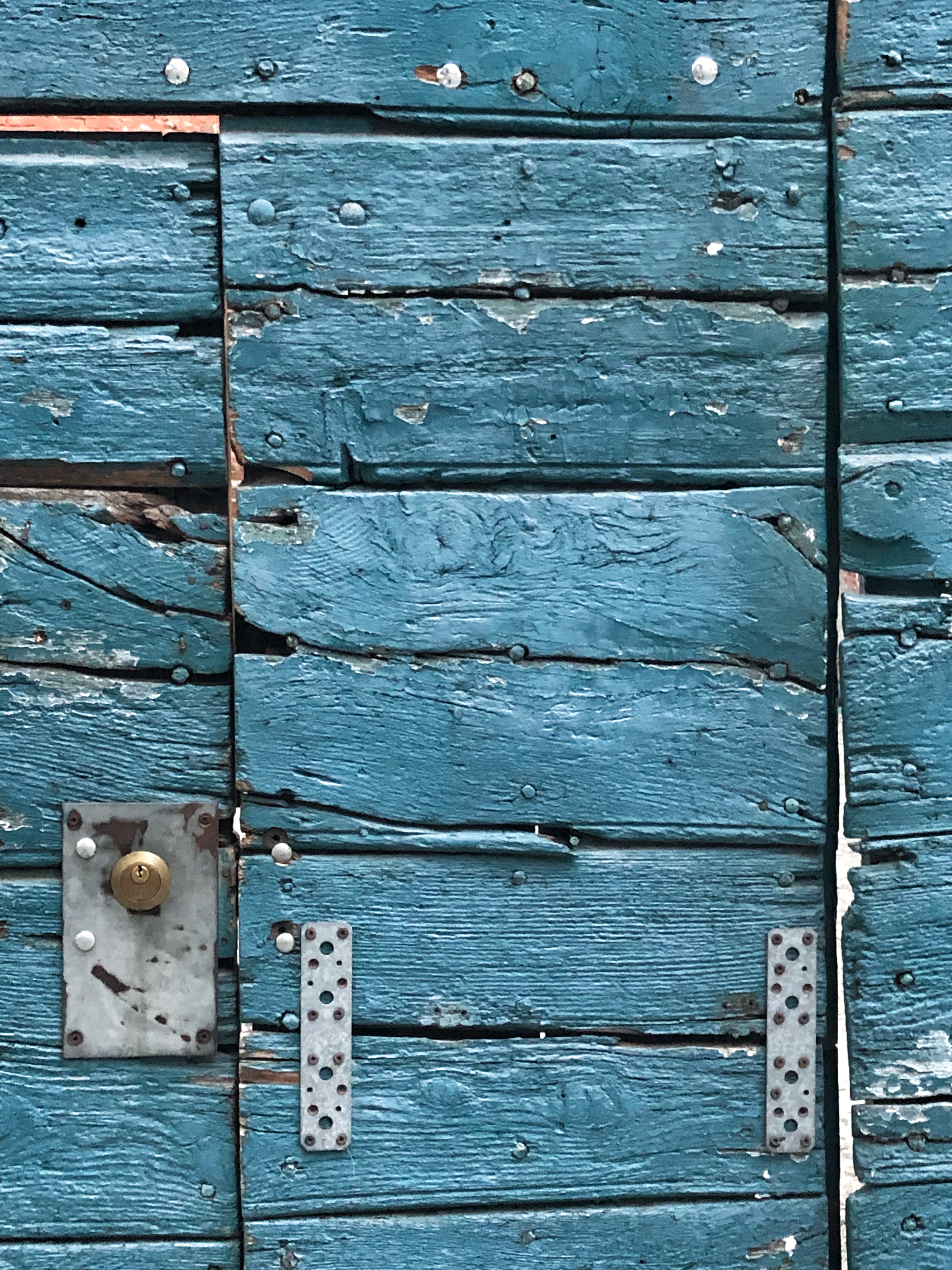 Una texture di un portone di un palazzo del centro città, piena di segni materici e lasciati dal tempo, e di piccoli interventi umani per il suo assemblaggio e per il mantenimento delle sue funzioni: piastre, chiodi e borchie. E il colore: sapete perché spesso i portoni delle case patrizie venivano dipinti con tinte della gamma dei verdi? Nell'edilizia storica ogni aspetto era curato e pensato, e questa tinta in particolare voleva evocare, pur data sul legno, un materiale più nobile: il bronzo, che quando si ossida diventa proprio di questo colore.