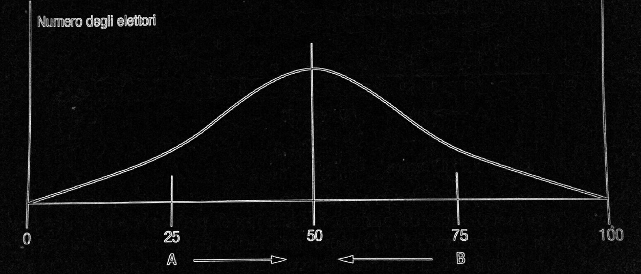 Una retta su cui sono rappresentati gli elettori con le loro posizioni ideologiche. Ne nasce un grafico a campana in cui abbiamo il maggior numero di elettori esattamente alla metà della retta. Man mano che ci si sposta alle estremità della linea, anche il numero di votanti scende gradualmente fino a non averne nessuno.