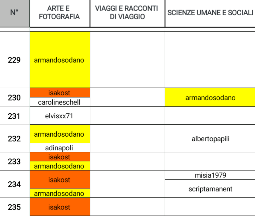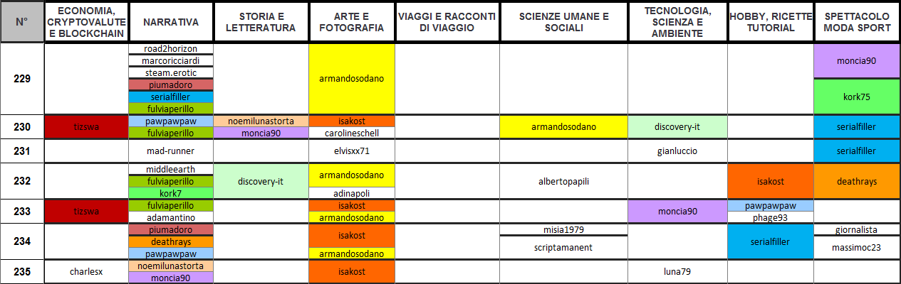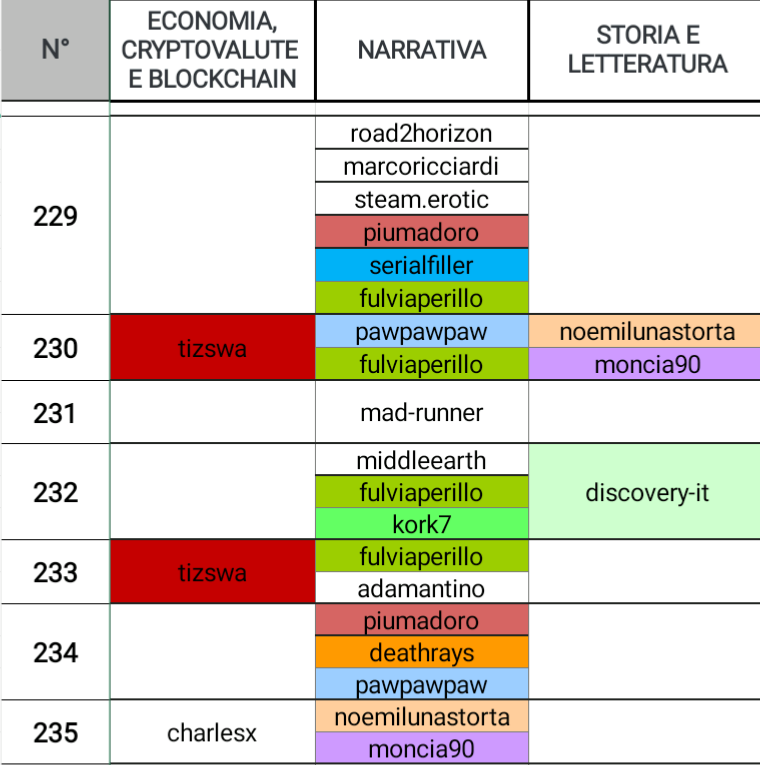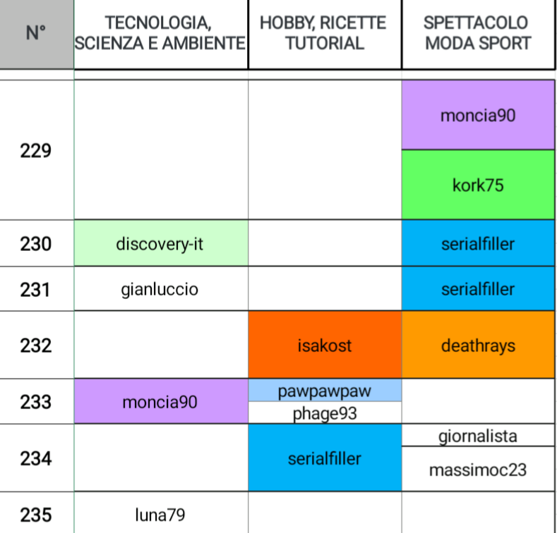 @fulviaperillo eccelle su quattro giornate, @piumadoro e @pawpawpaw si posizionano su due giornate, quest'ultima eccelle anche in HOBBY, RICETTE E TUTORIAL, @serialfiller eccelle anche in altre due categorie: HOBBY, RICETTE E TUTORIAL e SPETTACOLO, MODA E SPORT, @kork75 e @deathrays li ritroviamo più avanti anche in SPETTACOLO, MODA E SPORT, @noemilunastorta prende posto anche in STORIA E LETTERATURA, infine @moncia90 che eccelle anche in altre tre categorie: STORIA E LETTERATURA, TECNOLOGIA, SCIENZA E AMBIENTE e SPETTACOLO, MODA E SPORT.