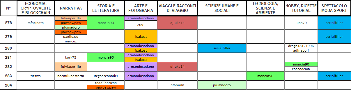Situazione ancora sottotono, nella prima colonna abbiamo due vittorie di @djluka14, nella seconda @serialfiller che eccelle anche più avanti in SPETTACOLO, MODA E SPORT con ben tre posizionamenti.