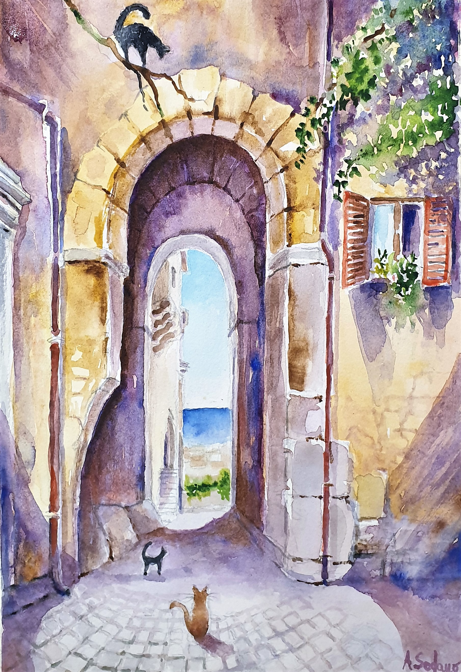 three of cats in the old town -watercolor- 4 steps