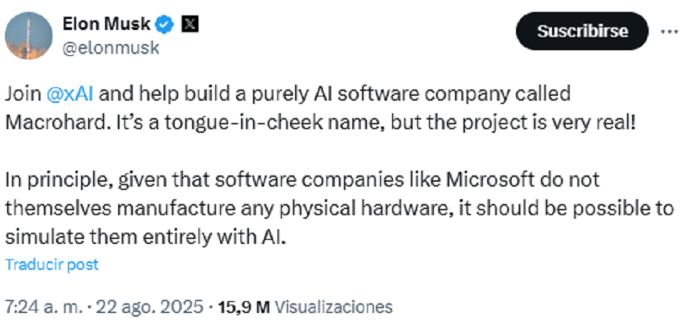 And here is an idea that mixes provocation and ambition. Can you imagine that one day an entire Microsoft could function without human workers and operating only with artificial intelligence? That is Elon Musk's bold proposal with the MacroHard project officially revealed by his AI company XAI.