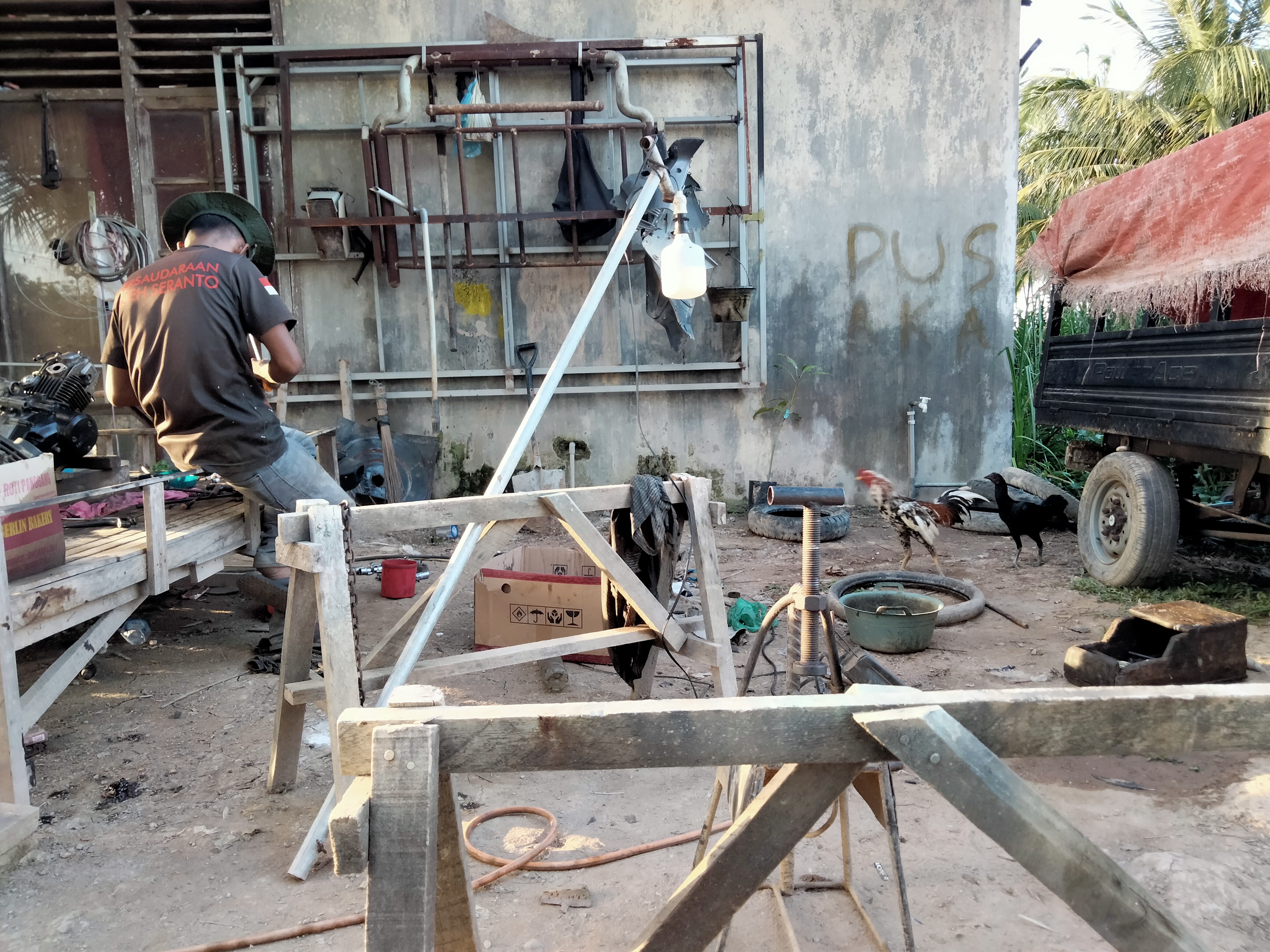 While I was waiting for my vehicle to be ready to be repaired in the welding workshop, there were several chickens passing through the area where people were working and walking around casually, surrounded by lots of wires that were still scattered on the floor.