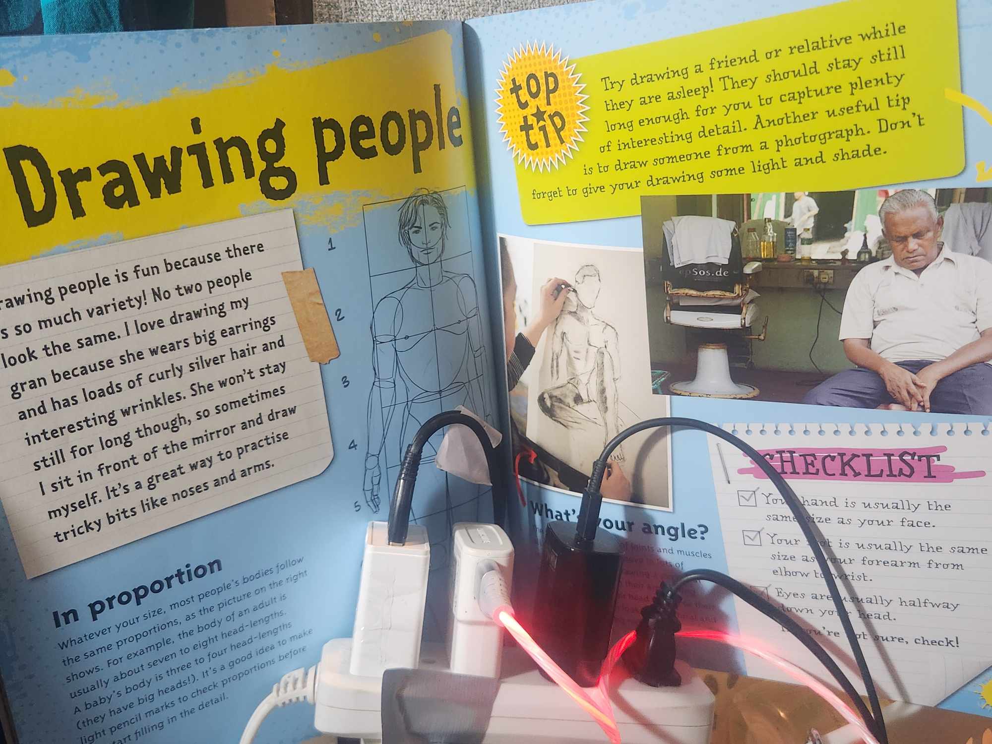 My grandson has an Art Book which I borrowed to get a model of a Man. I placed the particular page in the book which showed the man, a barber actually, taking a rest from his work, beside our phone chargers.