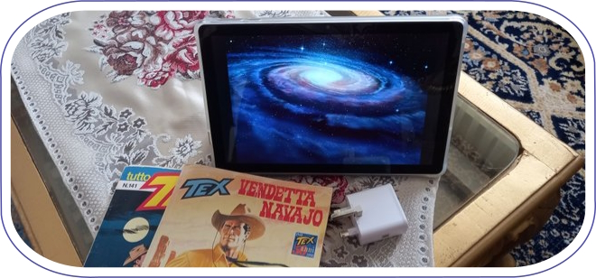 con uno schermo "spaziale" nelle vicinanze di un fumetto.