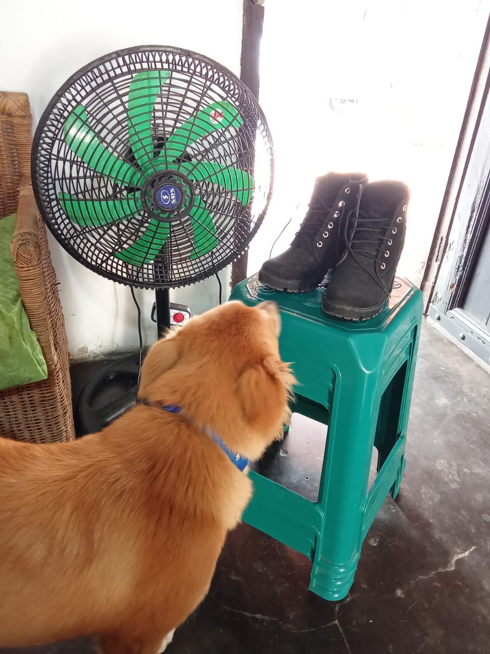 Vi que nuevamente se me iba a pasar la oportunidad de compartir mi fotografía, entonces dispuse todos los elementos: "ventilador y calzado", y apareció mi perra Susy a ver qué estaba haciendo. Así que mientras ella husmeaba, hice mi foto.
