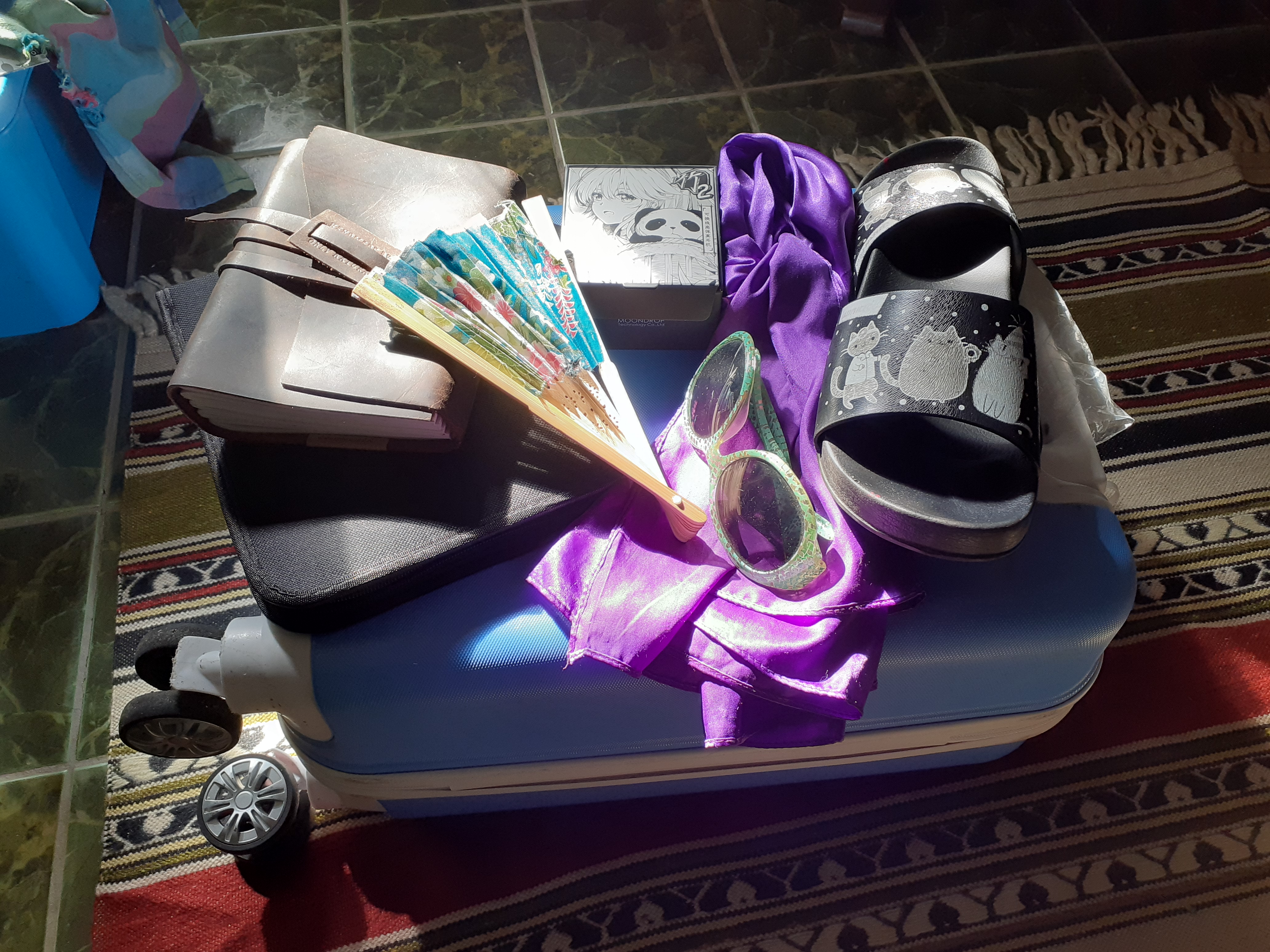 El tamaño de la maleta, el color de la bufanda, los lentes, el abanico, las carteras y el libro de caricaturas me hizo recordar a la maleta que llevaba al preescolar cuando tenía 6 años; y la diversión era hacer "juego de roles". Es decir, imaginarme que yo era mi mamá. Me encantó tu fotografía. Suerte.
