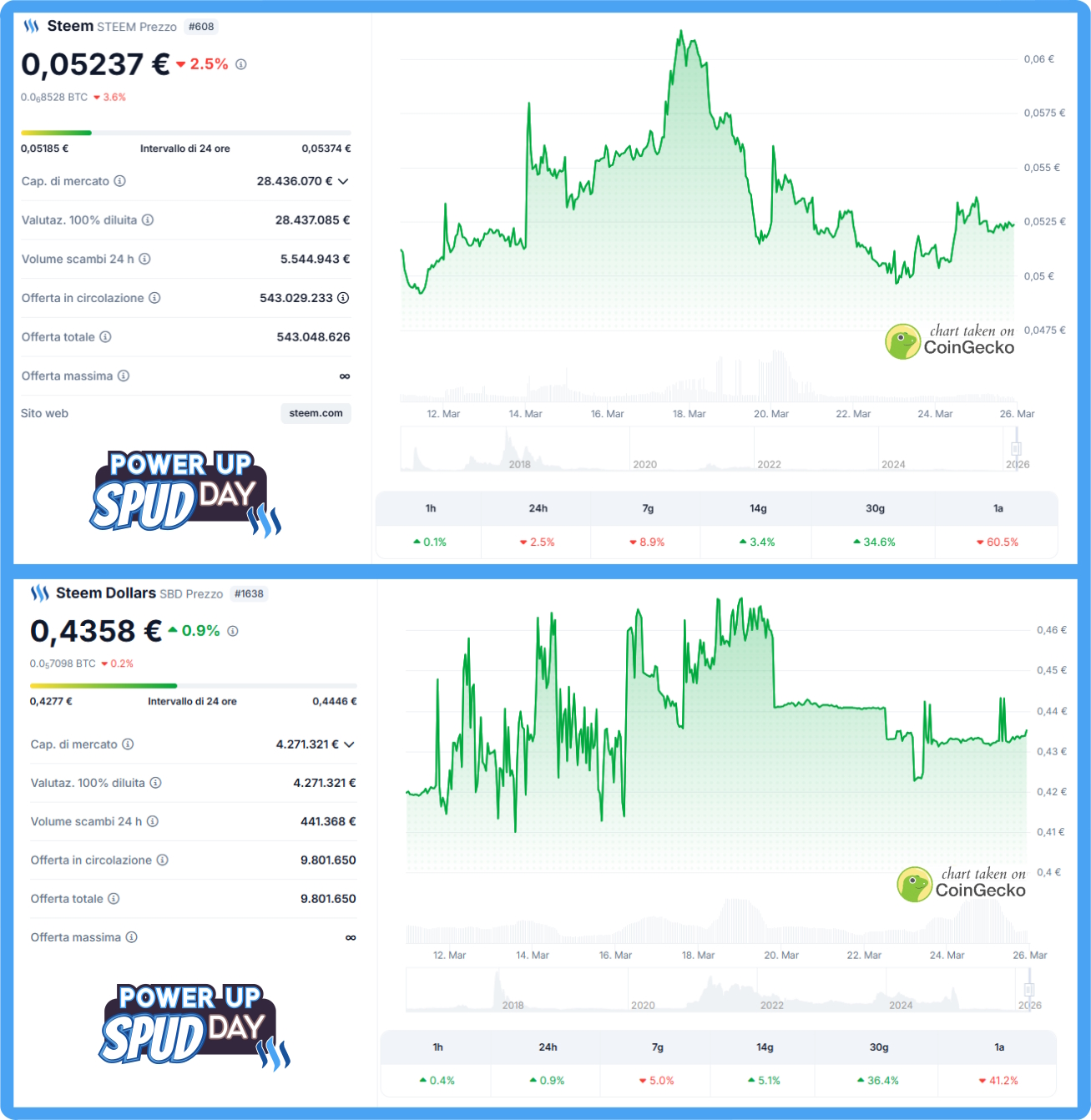 Below, you will find two charts taken from the Coingecko branded site. In addition to the STEEM token price, below you find the SBD token one, ie the STEEM BASED DOLLAR. The values are expressed in United States Dollars (USD), and date back to 23:15 about on March 25th, 2026, UTC+1 time zone.
