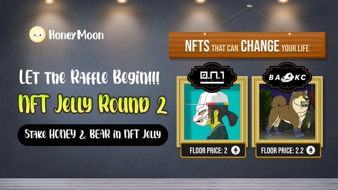 Ora NFT Jelly Round 2 è in corso, anche tu puoi avere la possibilità di vincere premi, qui puoi puntare $ BEAR su 0n1Force-0N1 # 5058 e $ HONEY su Bored Ape Yacht Club-Bored Ape Kennel Club # 9049.