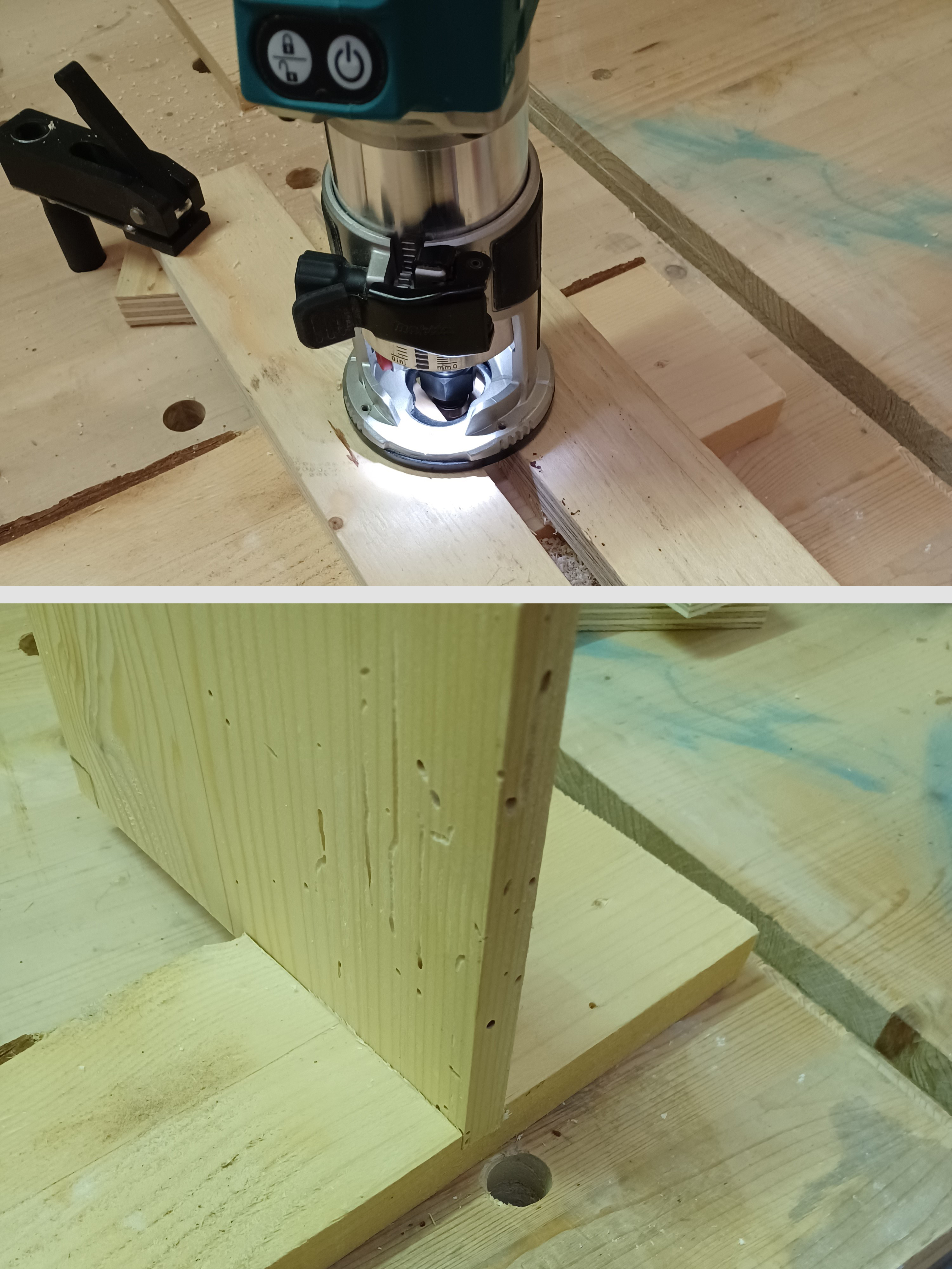 Ed ecco l'utilizzo, dopo aver fissato le guida con dei morsetti, possiamo usaare la fresatrice palmare con una fresa a copiare, e otterremo un binario del perfetto spessore per il nostro pannello.