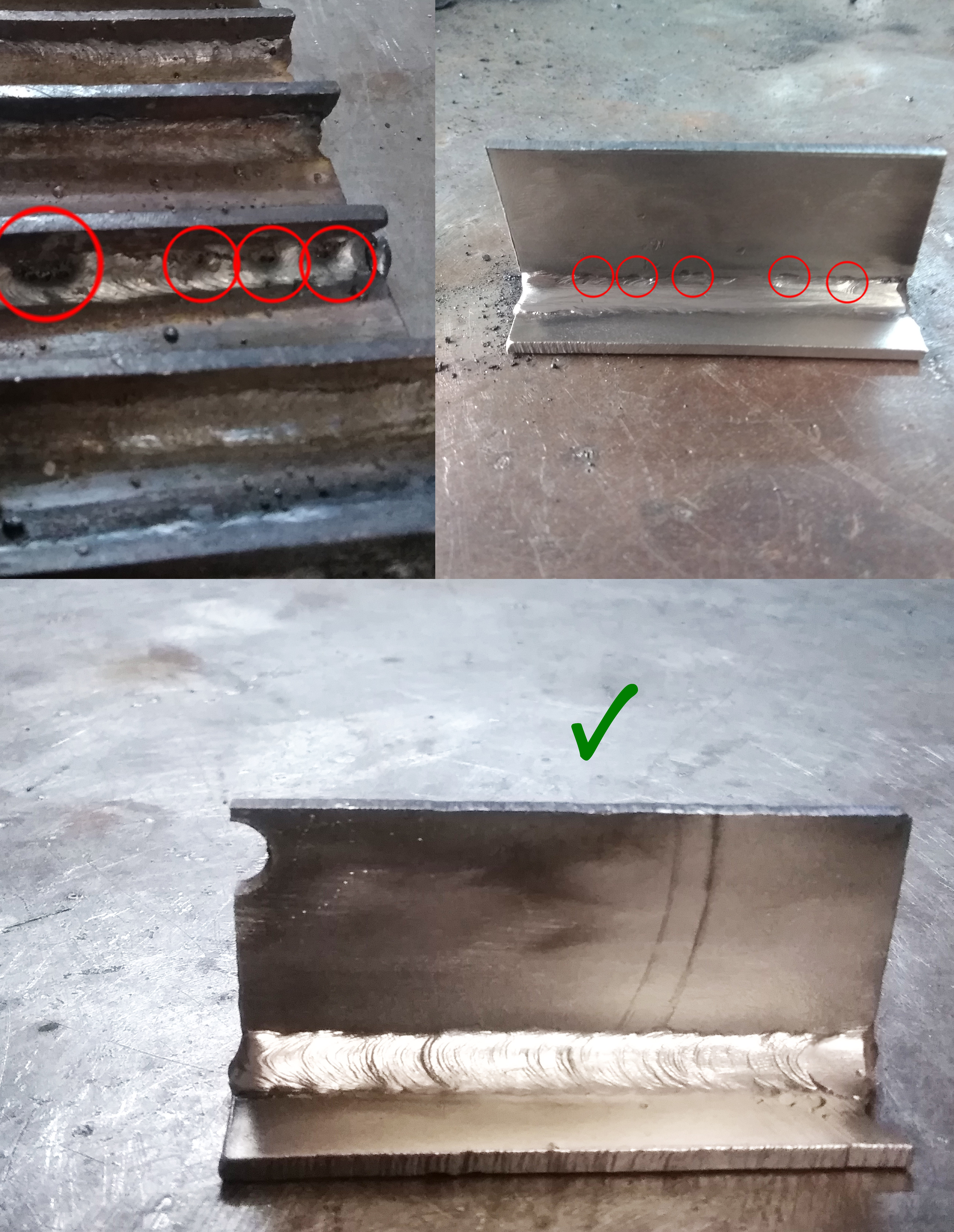 Bastano delle piccole imprecisioni in questi parametri e si hanno, a fine saldatura, i classici errori di noi principianti che vedete in foto: soffiature, inclusioni di scoria, eccessiva penetrazione.