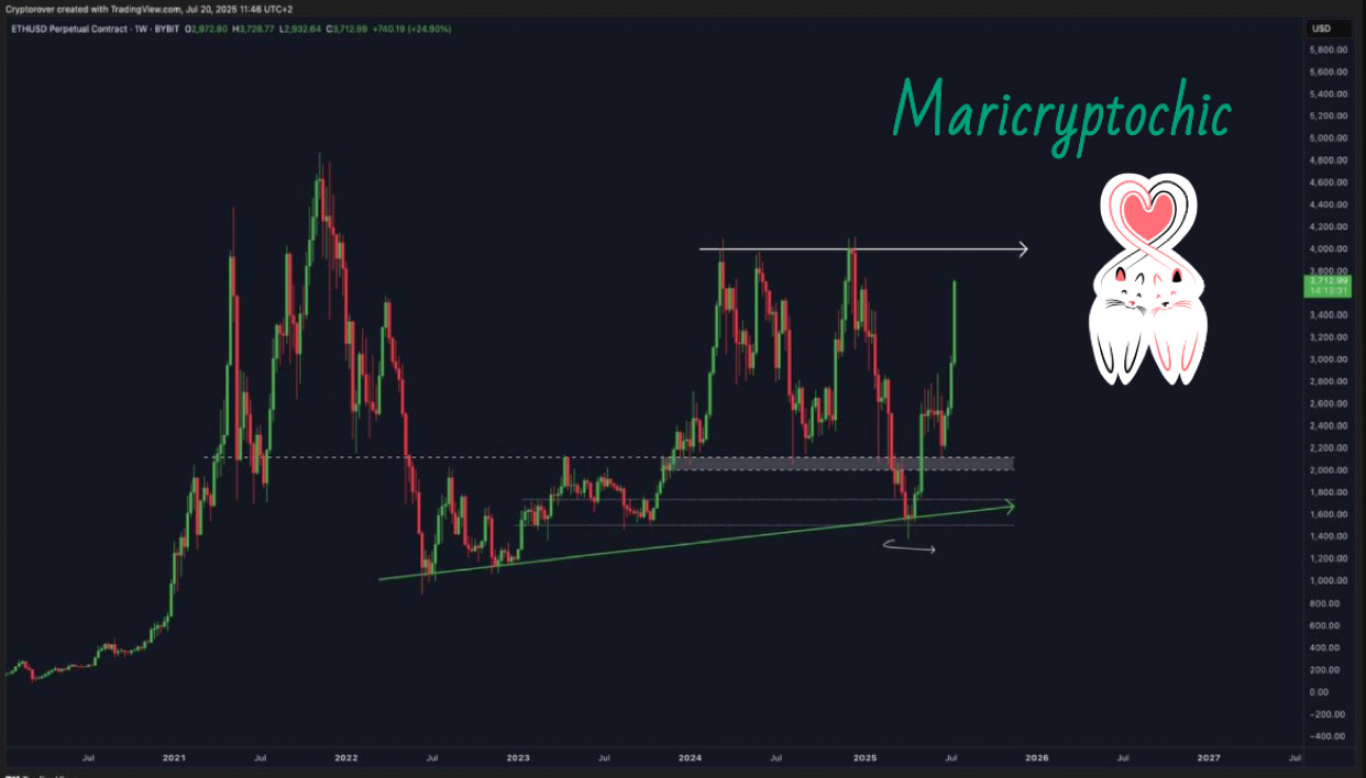 Ethereum has touched $3,700, moving ever closer to the key $4,000 area, a level never surpassed in this cycle.