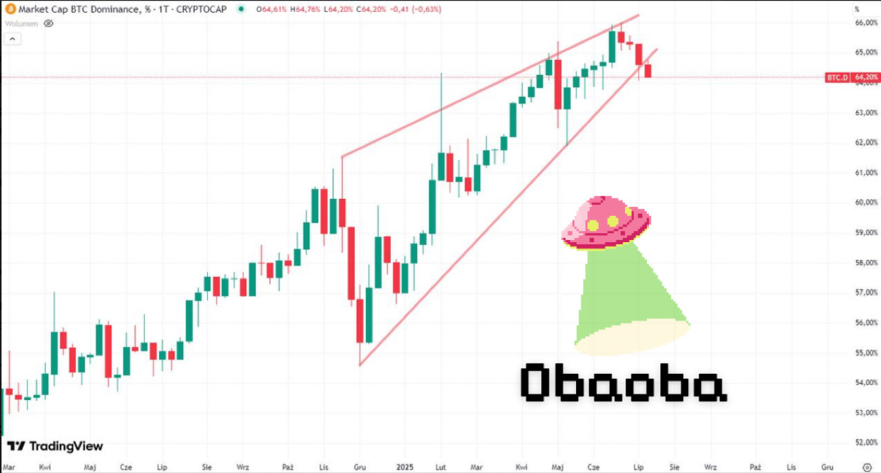 Dominance has fallen from a peak of 66% to around 63.8%, but it's still too early to talk about a clear reversal.