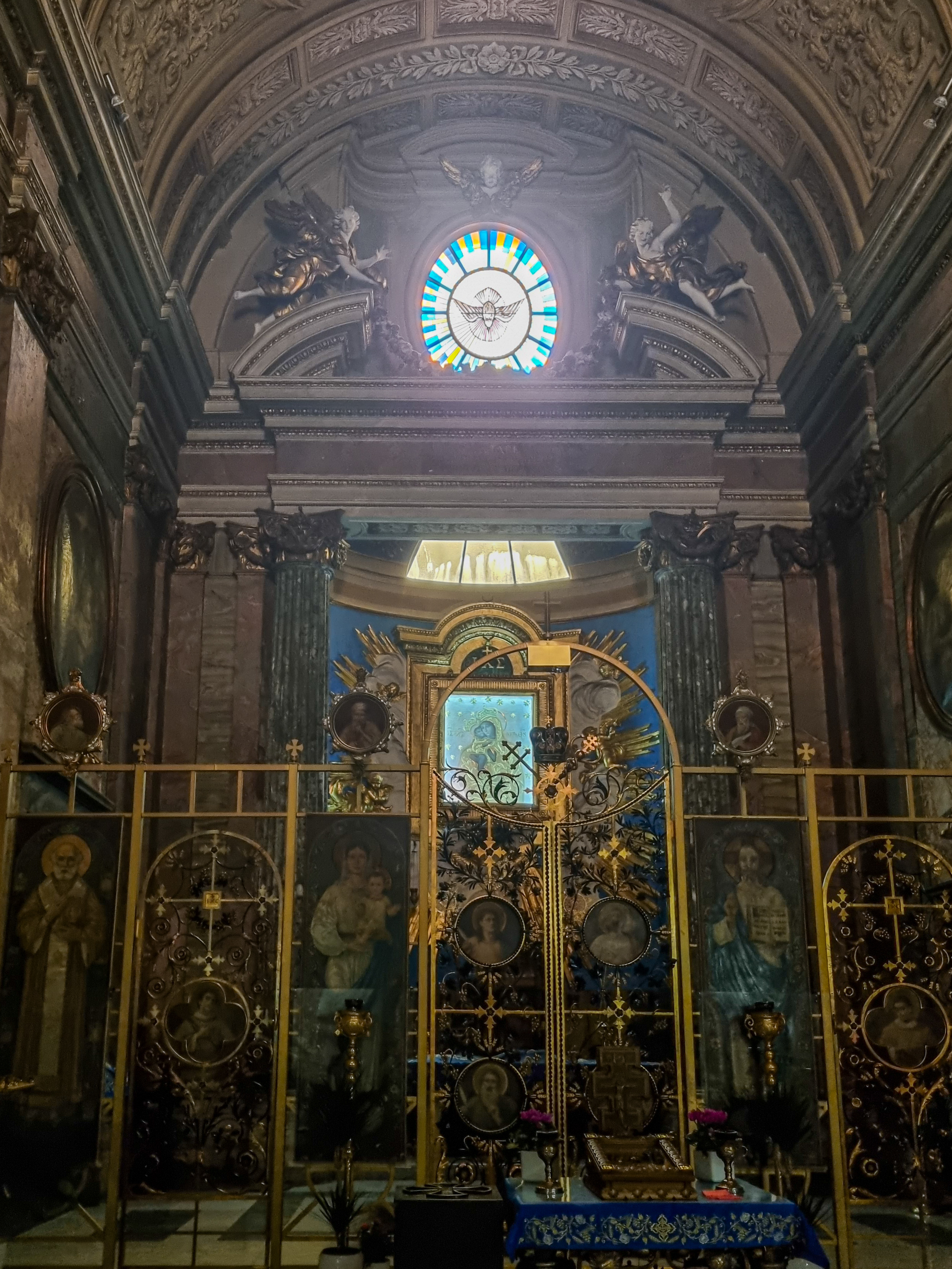Inside, the church is adorned with an iconostasis, an essential element of Eastern Christian liturgical tradition. The iconostasis is crafted in vivid gold, blue, and red tones, symbolising the sacred boundary between the earthly and the divine. The walls feature icons created by Ukrainian artists, blending classical Byzantine style with elements of Ukrainian folk art.