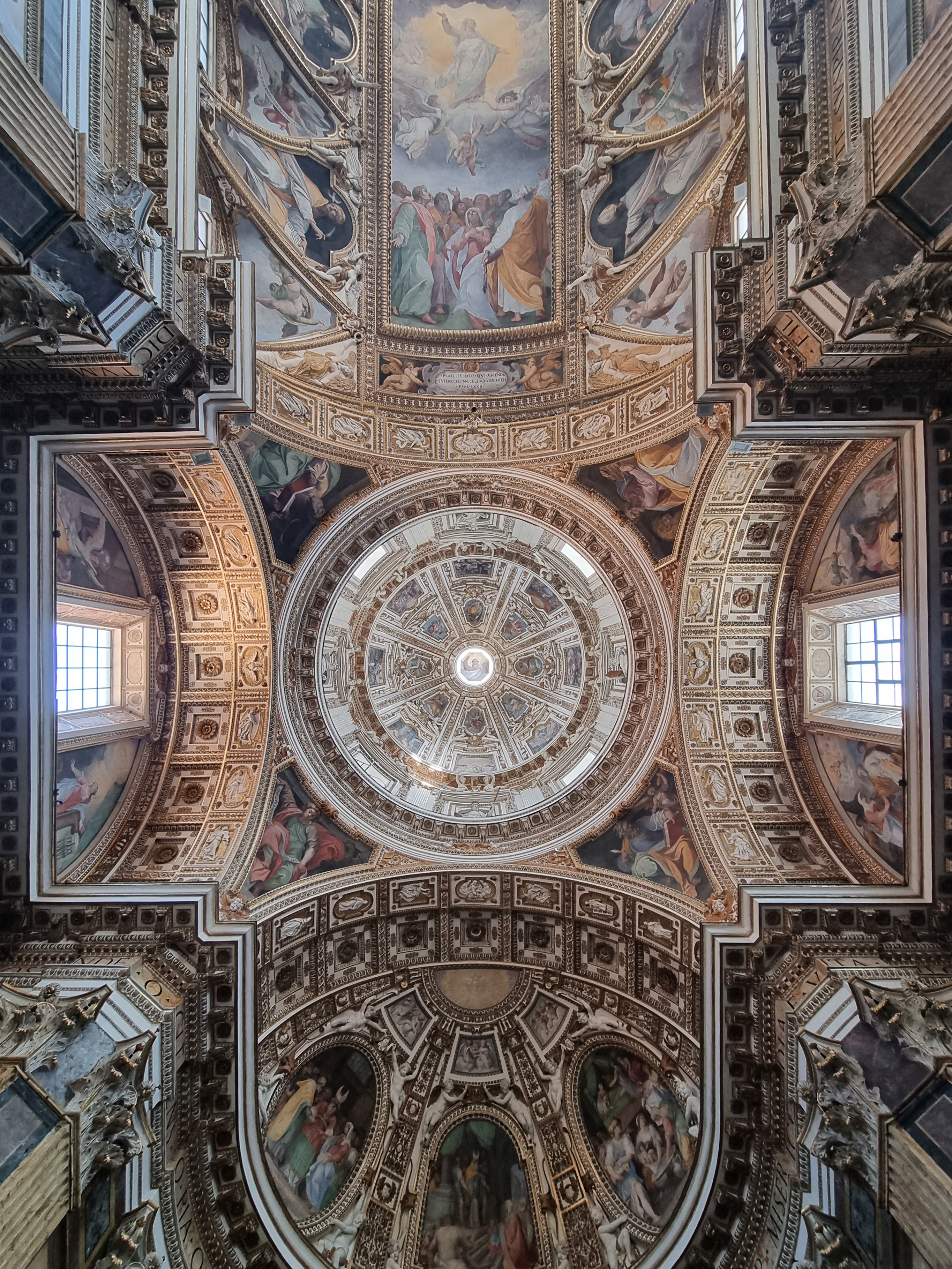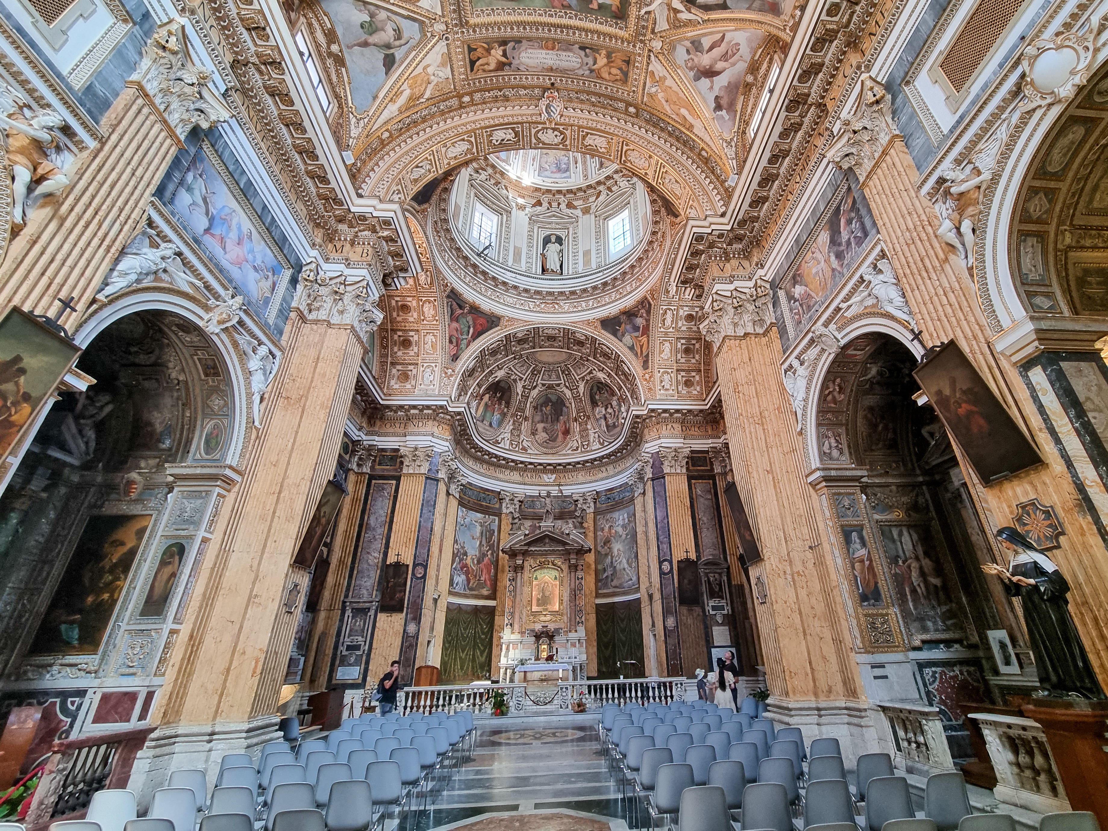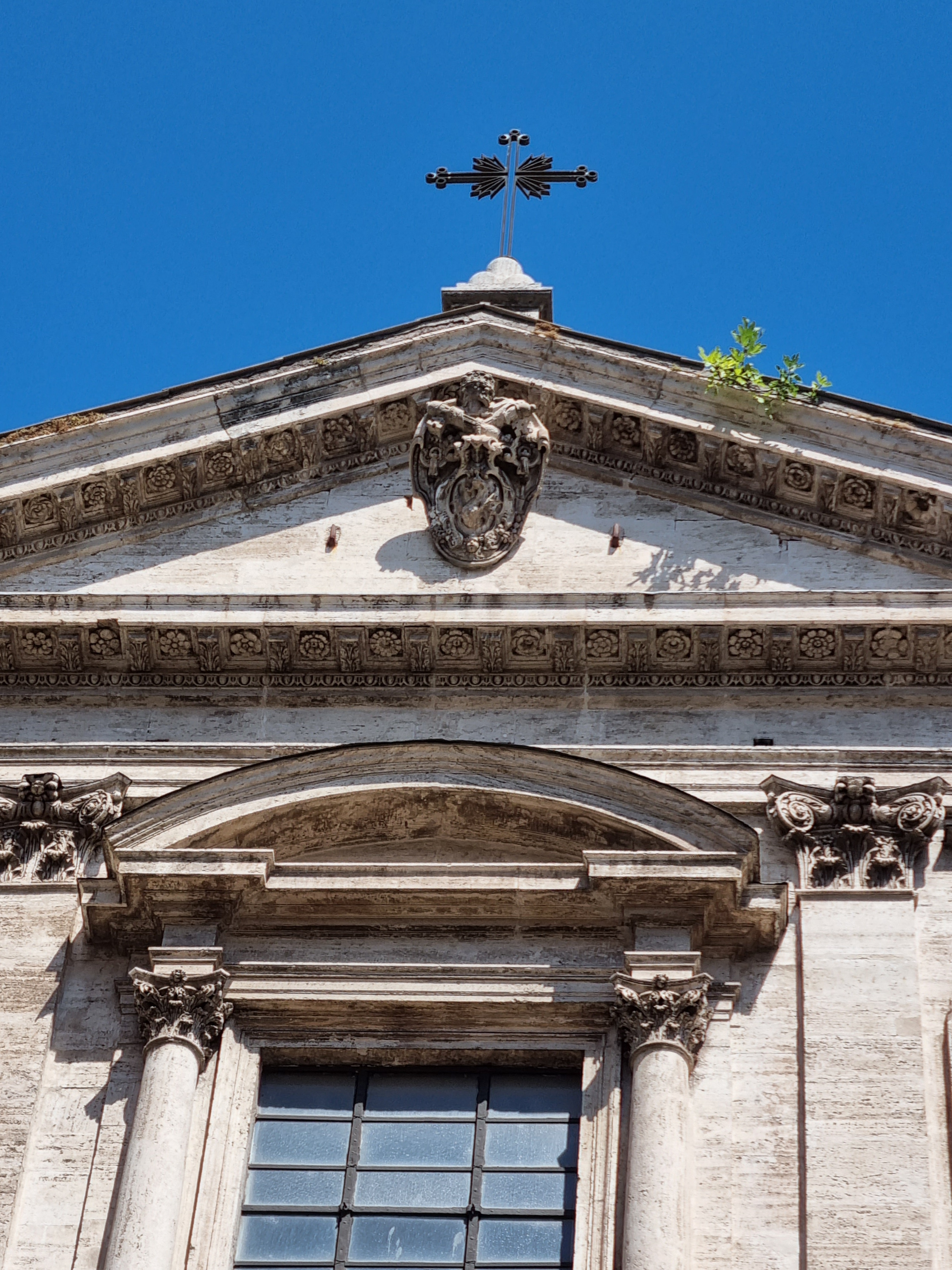 The facade reflects the elegance and simplicity typical of late Renaissance Roman architecture, highlighted by columns and a triangular pediment. Inside, the church follows a Latin cross layout, adorned with exquisite frescoes and marble decorations. The artistic embellishments were primarily executed by painters from the schools of Cesare Nebbia and Giovanni Battista Ricci, contributing to the church’s visual richness.