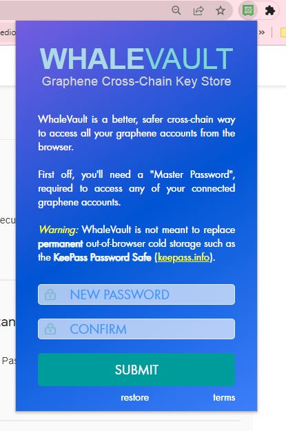 At this point you can access WhaleVault, by clicking on the puzzle-shaped image, located to the right of the browser address bar and a window will open in which to enter a password of your choice that will be needed to do subsequent LOGIN into WhaleVault.