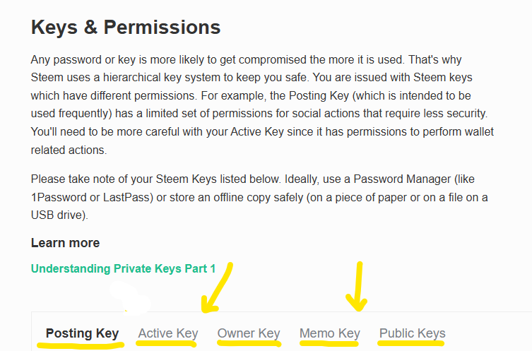 Once in the wallet of our Steemit account, you can download all the keys that allow access to the platform and its use by clicking on "KEYS AND PERMISSIONS".