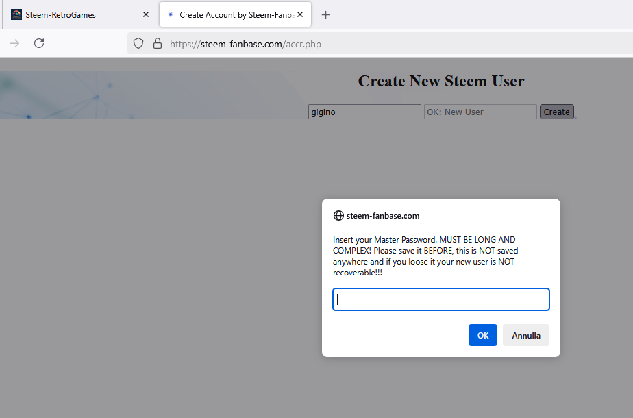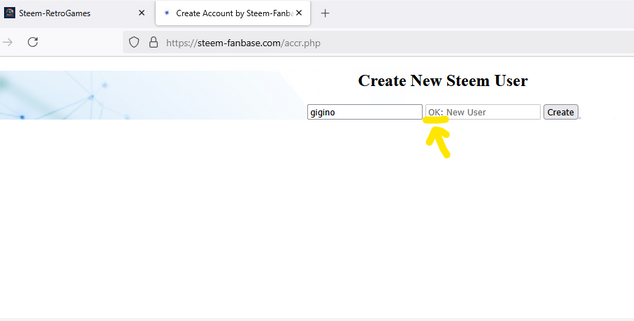 Once you click on CREATE A NEW STEEM USER, a page from STEEM-FANBASE, the tool managed by @italygame that automates vote assignments on the Steem blockchain, will open. Here you will need to enter the name chosen for the new Steemit account.