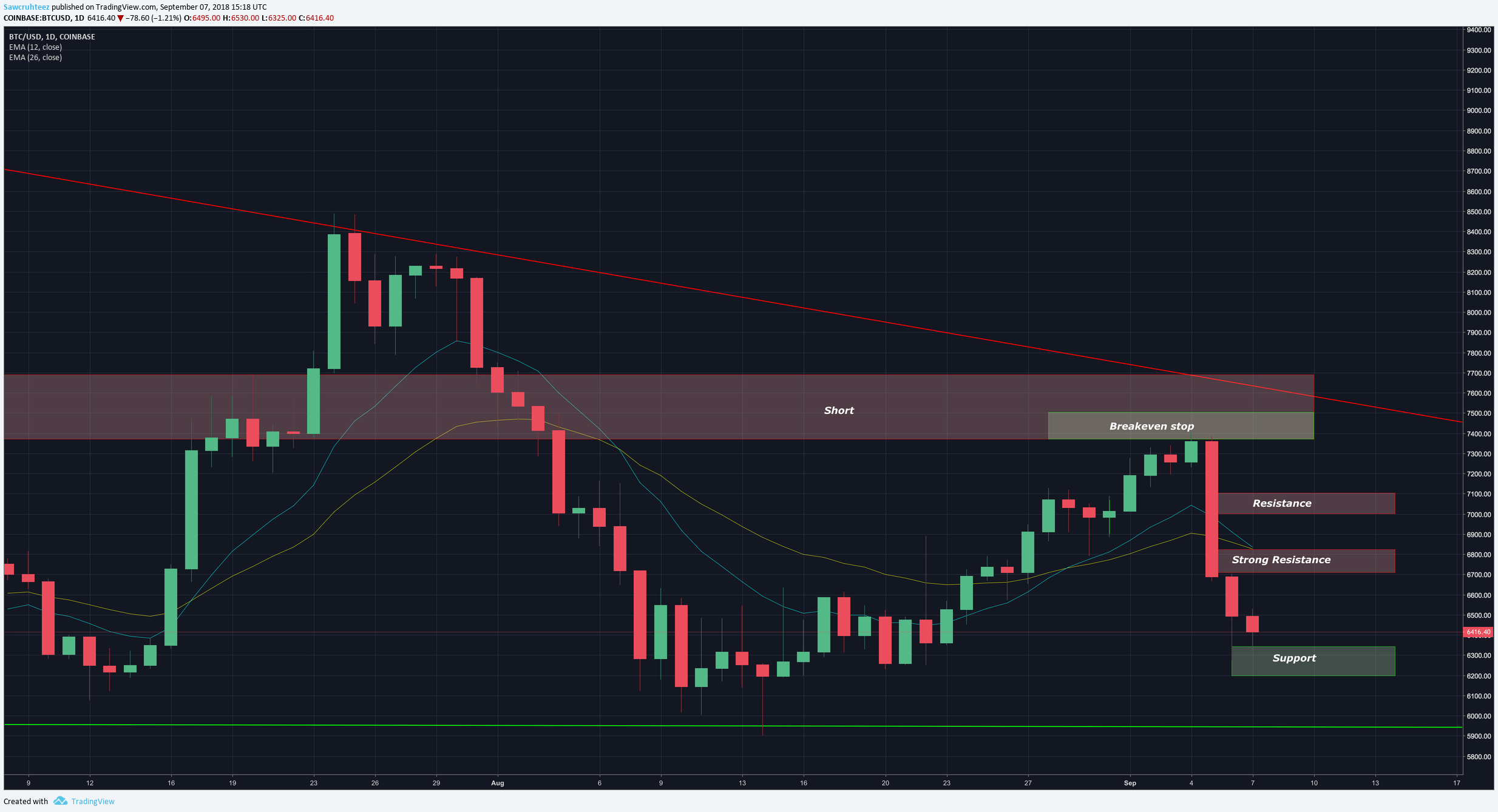 Previous analysis / position: If not in a position then wait for a bounce and be ready to short. If you did take a position in the last couple days then taking some profit with the intention to re open on a bounce seems like a good plan. / Short ETH:USD. Took profit on 33% of position improving my average cost basis to $317.37 per ETH.