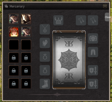 Next up we have "mercenary" Here you can view your characters and their items. As we can see we begin with four different characters. Two more slots are available to add characters. Six slots are locked for now. If you hold your mouse over one of your characters you can see their name and stats. (Level, HP, etc).