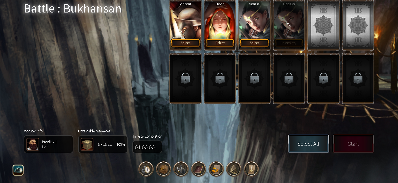 Here we can get into our first fight. We can battle a Bandit level 1 and obtain a resource that is just called "piece". The mission will take one hour. I decided to send two of my heroes into the battle just to be on the safe side.