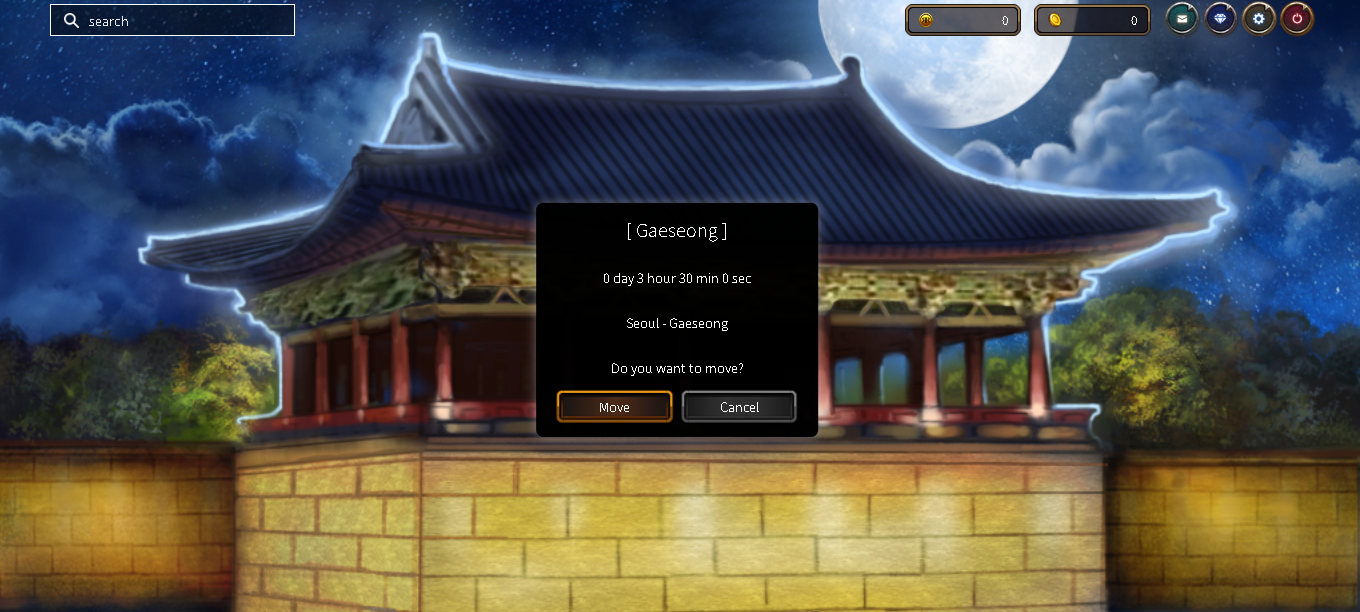 Lets say we want to visit "Gaeseong". We click on the city to find out how long it will take us to get there.